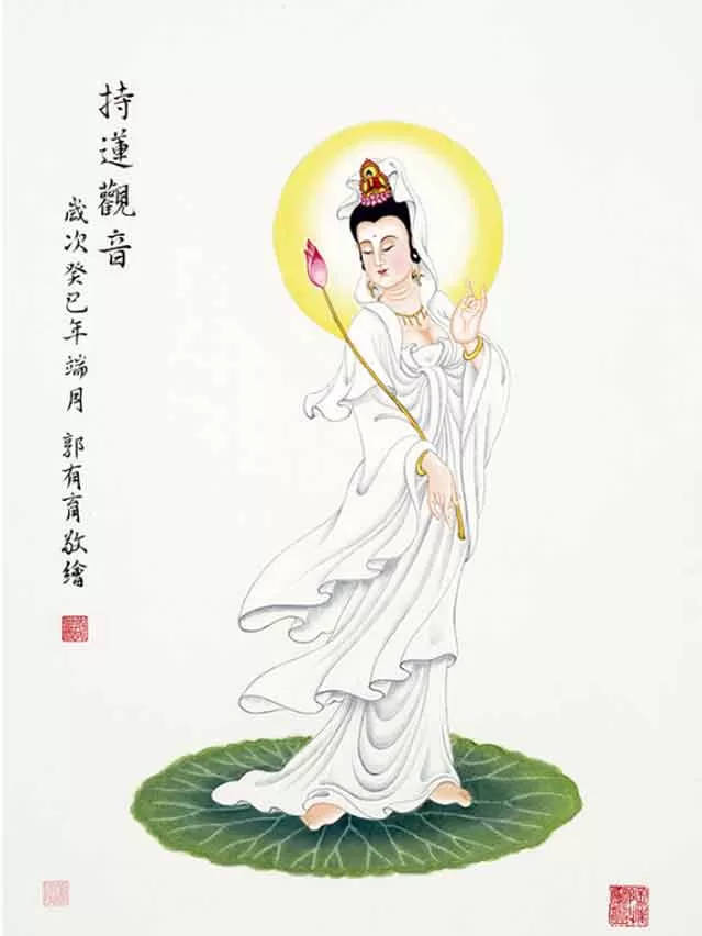 Đây là Quán Thế Âm Bồ tát tay cầm hoa sen. Quán Thế Âm Bồ tát lấy hoa sen để biểu trưng cho bổn thệc của mình, dùng búp sen nở hoặc đóa sen nở làm vật cầm tay, cũng gọi là Liên Hoa thủ (Padmapàni). Lại lấy hoa sen làm đài, cho nên Ngài có nhân duyên dặc biệt với hoa sen.