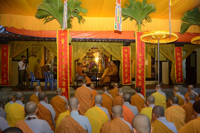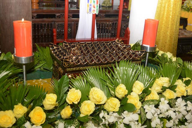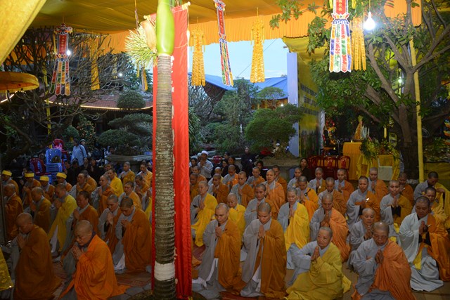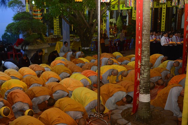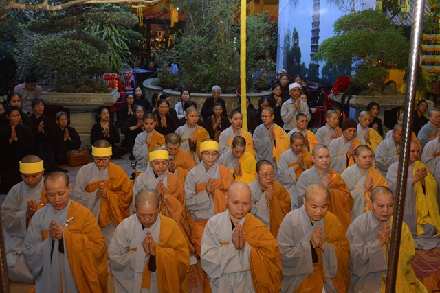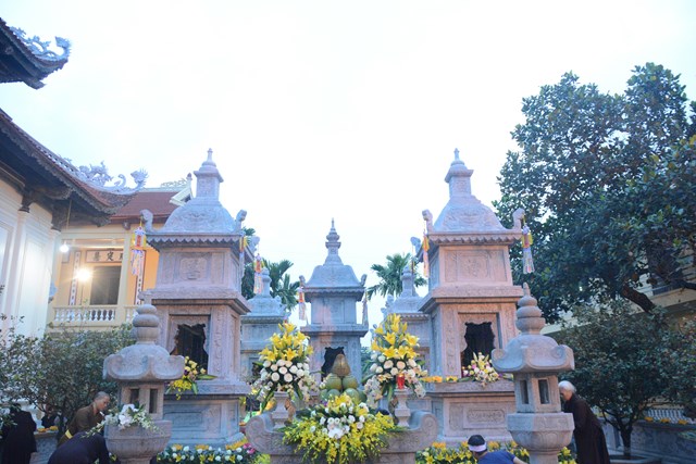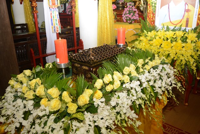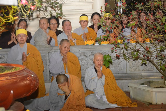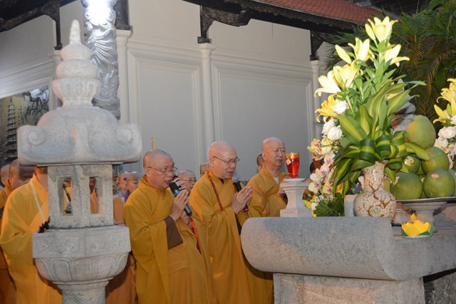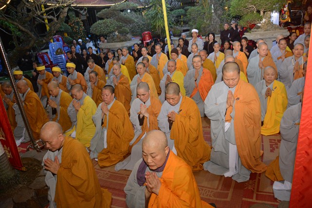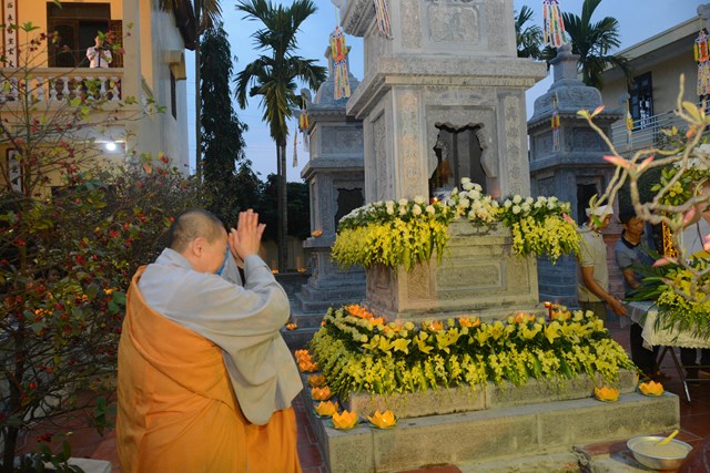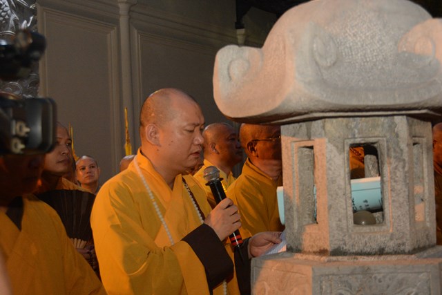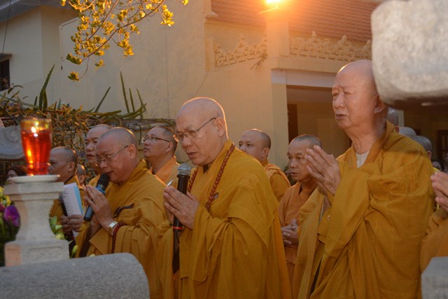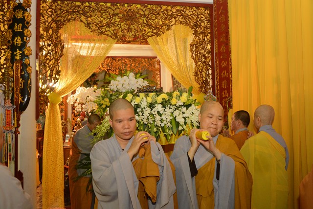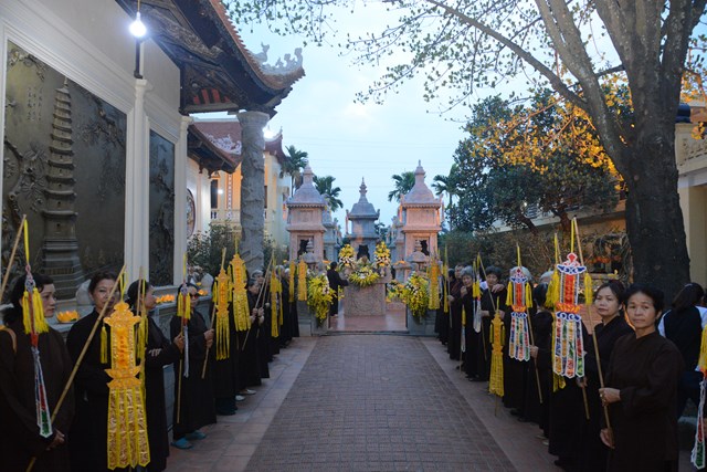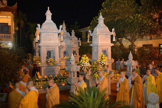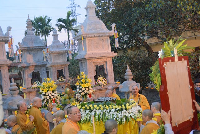 Đúng 18 giờ 30 phút, dưới sự điều hành và chứng minh của Đại lão Hòa thượng Thích Trí Tịnh - Thành viên HĐCM TƯ GHPGVN, toàn thể môn đồ pháp quyến, thân quyến của Ni trưởng Thích Diệu Tâm đã trang nghiêm thành kính đối trước xá lợi của cố Ni trưởng và cung thỉnh xá lợi của Ngài từ Tổ đường ra vườn tháp của chùa để nhập bảo tháp.