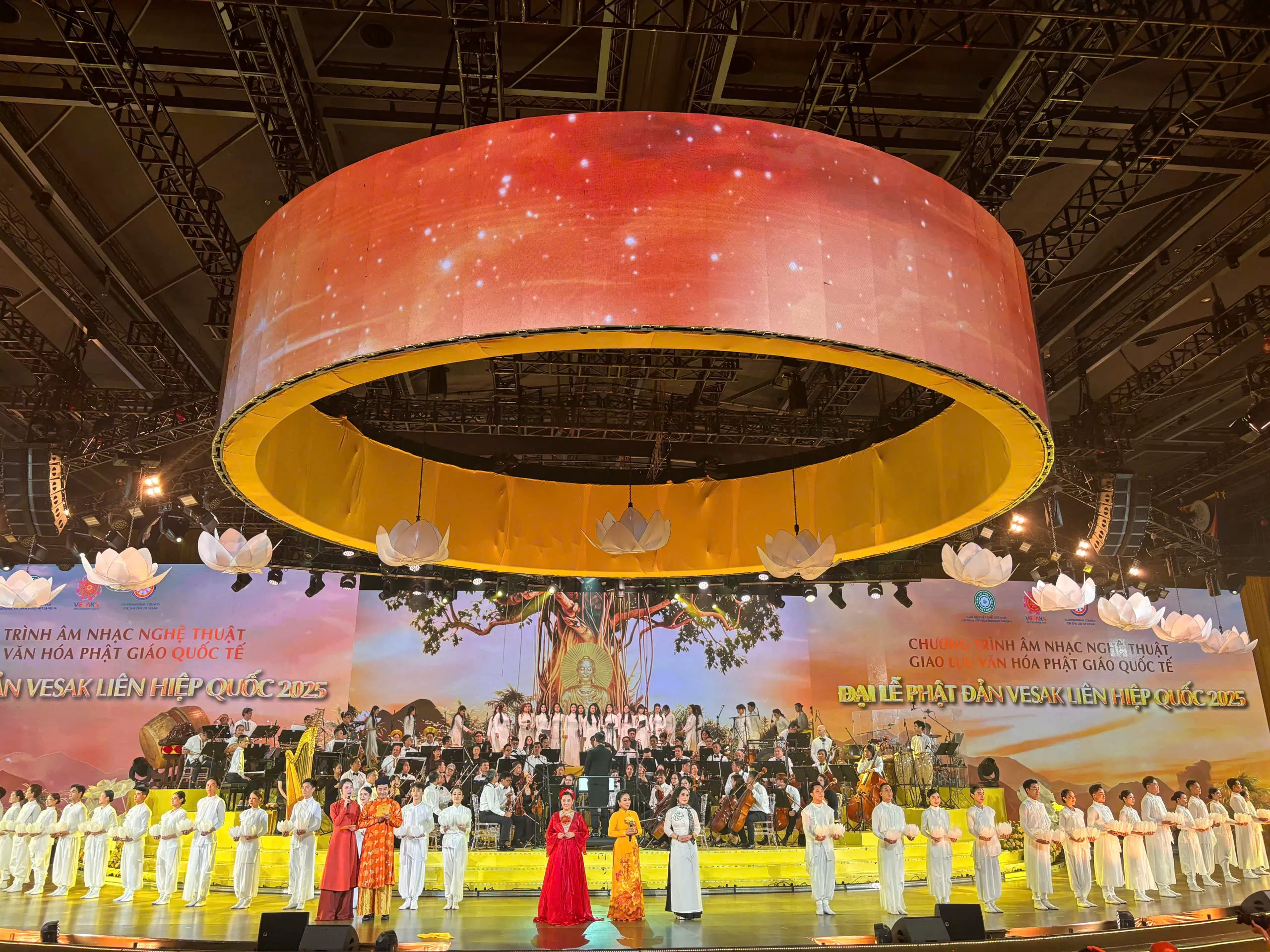 Giao lưu Âm nhạc Nghệ thuật Vesak 2025 không chỉ là một điểm nhấn nghệ thuật đặc sắc trong mùa Đại lễ, mà còn là nhịp cầu kết nối văn hóa – tâm linh, đưa hình ảnh Việt Nam hiền hòa và sâu sắc lan tỏa đến bạn bè năm châu. Khép lại chương trình trong không khí trang nghiêm và rộn ràng với ca khúc “Đất Nước Trọn Niềm Vui”, thể hiện niềm tin và niềm hân hoan vào sự hòa bình và phát triển. Chương trình không chỉ là sự kiện nghệ thuật đơn thuần mà còn là thông điệp văn hóa sâu sắc, khẳng định vai trò của âm nhạc như một ngôn ngữ kết nối nhân loại, lan tỏa tinh thần Phật giáo đến gần hơn với công chúng trong và ngoài nước. Một sự kết nối giữa đạo và đời, giữa truyền thống và hiện đại, giữa Việt Nam và thế giới – tất cả hòa quyện trong âm nhạc nghệ thuật mang đậm tinh thần Phật giáo.