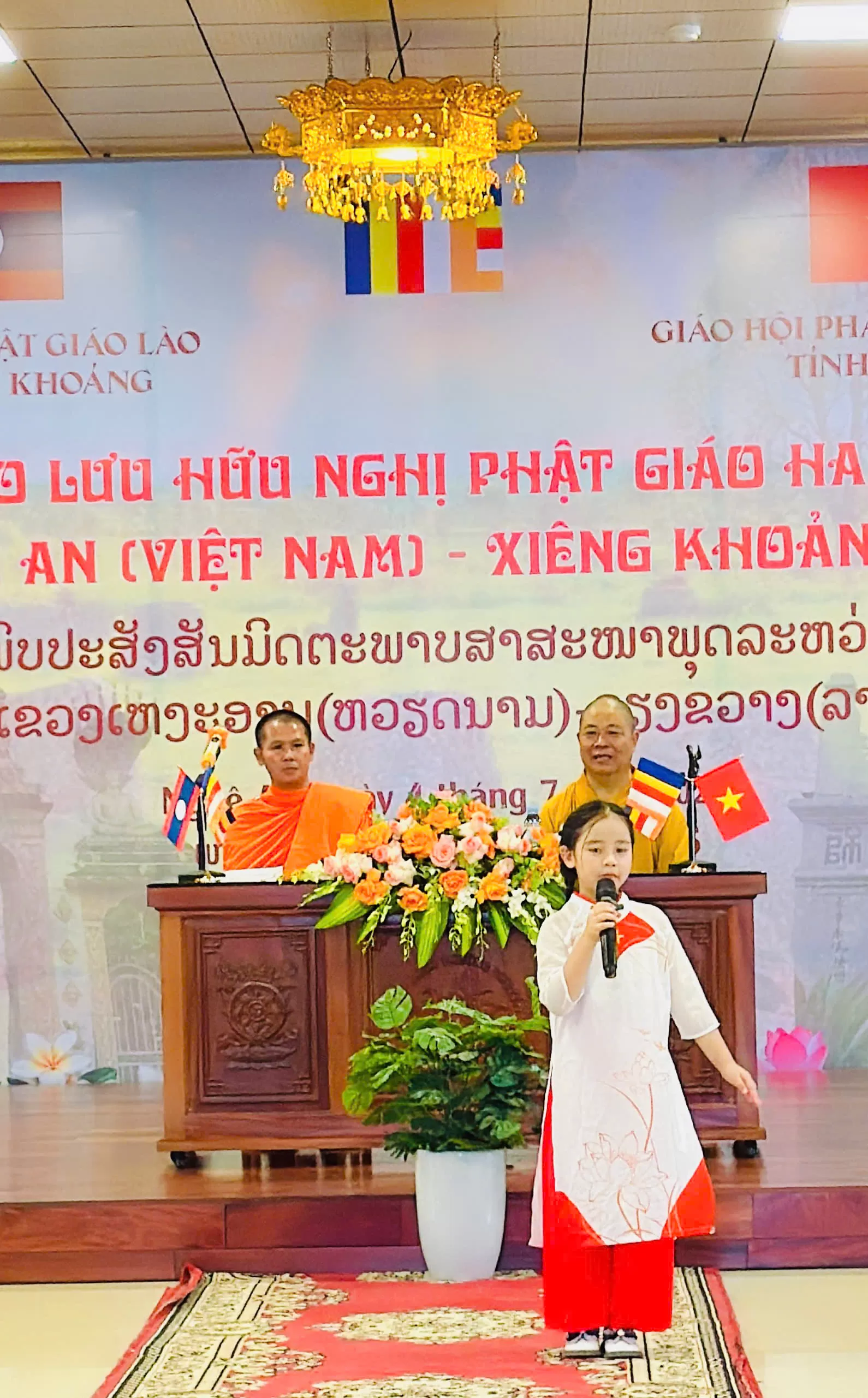 Chương trình giao lưu hôm nay, không chỉ là dịp giao lưu văn hóa, chia sẻ kinh nghiệm tu học, mà còn là nhịp cầu tâm linh gắn kết tình cảm giữa hai tổ chức Phật giáo, góp phần vun đắp mối quan hệ hữu nghị truyền thống giữa nhân dân hai tỉnh, hai đất nước Việt – Lào anh em mãi mãi xanh tươi, đời đời bền vững như sinh thời Hồ Chủ tịch đã căn dặn: “Việt Lào 02 nước chúng ta, tình sâu hơn nước Hồng Hà Cửu Long”. Cũng là để tình pháp lữ thiêng liêng giữa Phật giáo tỉnh Nghệ An và Phật giáo tỉnh Xiêng Khoảng ngày càng thắm thiết, bền vững và phát triển sâu rộng như màu hoa sen xinh đẹp tinh khiết và hoa Cham Pa thuần khiết thơm ngát, lan tỏa tinh thần hòa hợp, tiến tu phụng sự nhân sinh.
