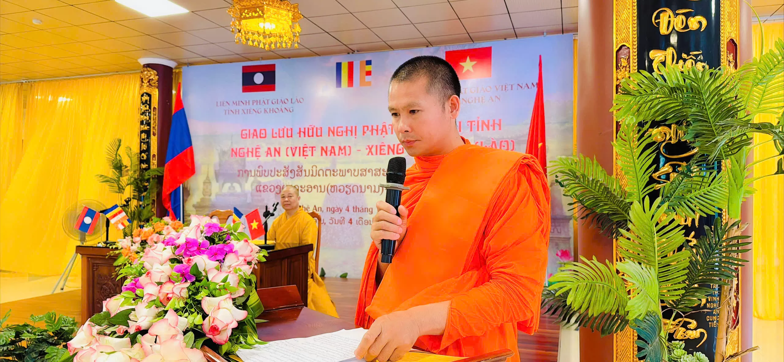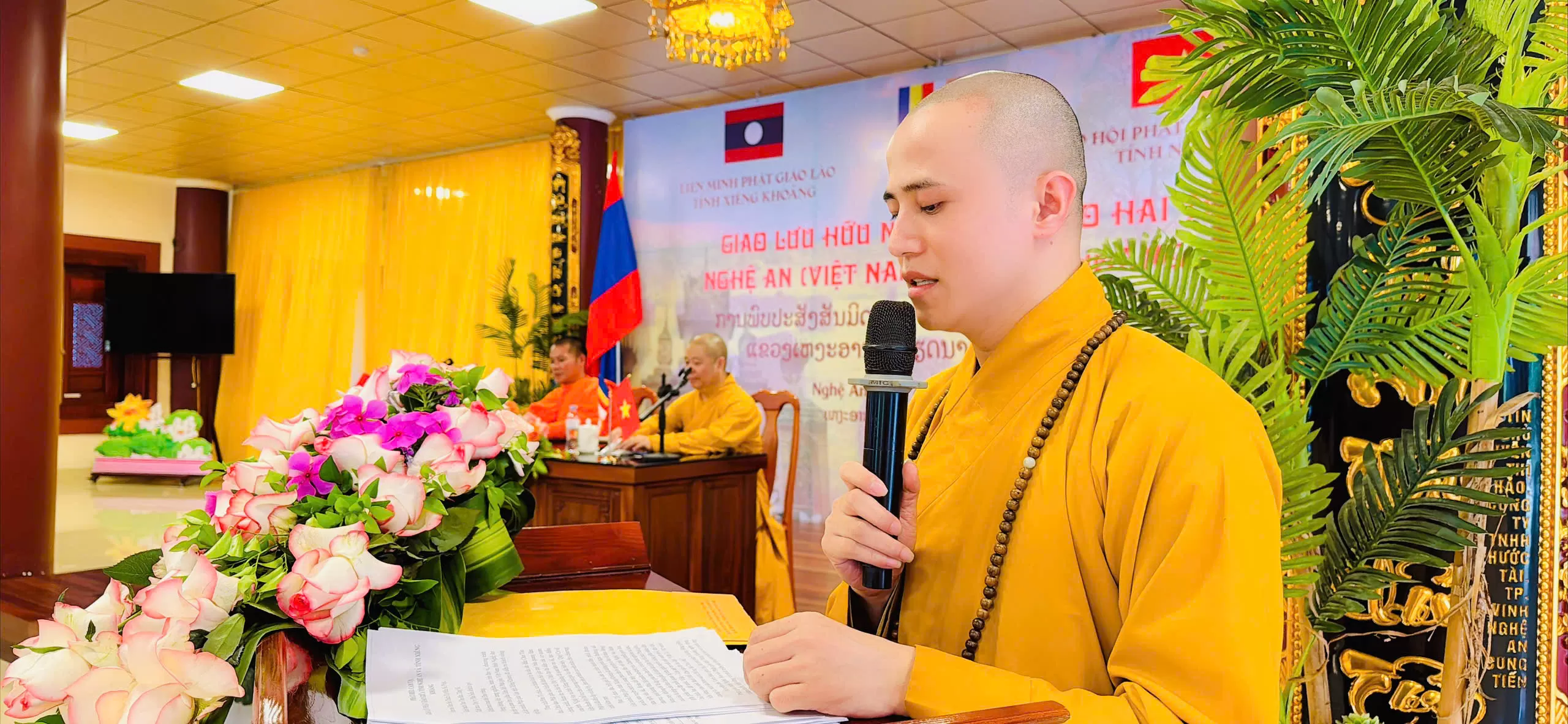Chương trình giao lưu hôm nay là dịp quý báu để chúng ta cùng nhau làm thắm thêm tình hữu nghị thiêng liêng giữa hai đất nước, cùng chia sẻ kinh nghiệm trong tu học và hoằng pháp, cùng thắp lên ngọn đuốc trí tuệ và từ bi, như lời Đức Phật đã dạy, để soi sáng cuộc đời, làm lợi lạc cho nhân sinh. Đồng thời, đây cũng là dịp để tăng cường mối quan hệ đoàn kết, hợp tác giữa Giáo hội Phật giáo tỉnh Nghệ An và Liên minh Phật giáo Lào tỉnh Xiêng Khoảng, góp phần vào việc củng cố tình hữu nghị giữa nhân dân hai tỉnh, hai quốc gia. Tăng Ni, Phật tử Nghệ An gửi lời cảm ơn chân thành đến phái đoàn Liên minh Phật giáo Lào tỉnh Xiêng Khoảng đã không quản ngại đường sá xa xôi, sơn xuyên cách trở, mang theo tâm bi nguyện to lớn và tấm lòng hữu nghị sâu sắc, đoàn kết thủy chung đến với tỉnh Nghệ An thân thương, quê hương Bác Hồ muôn vàn kính yêu.