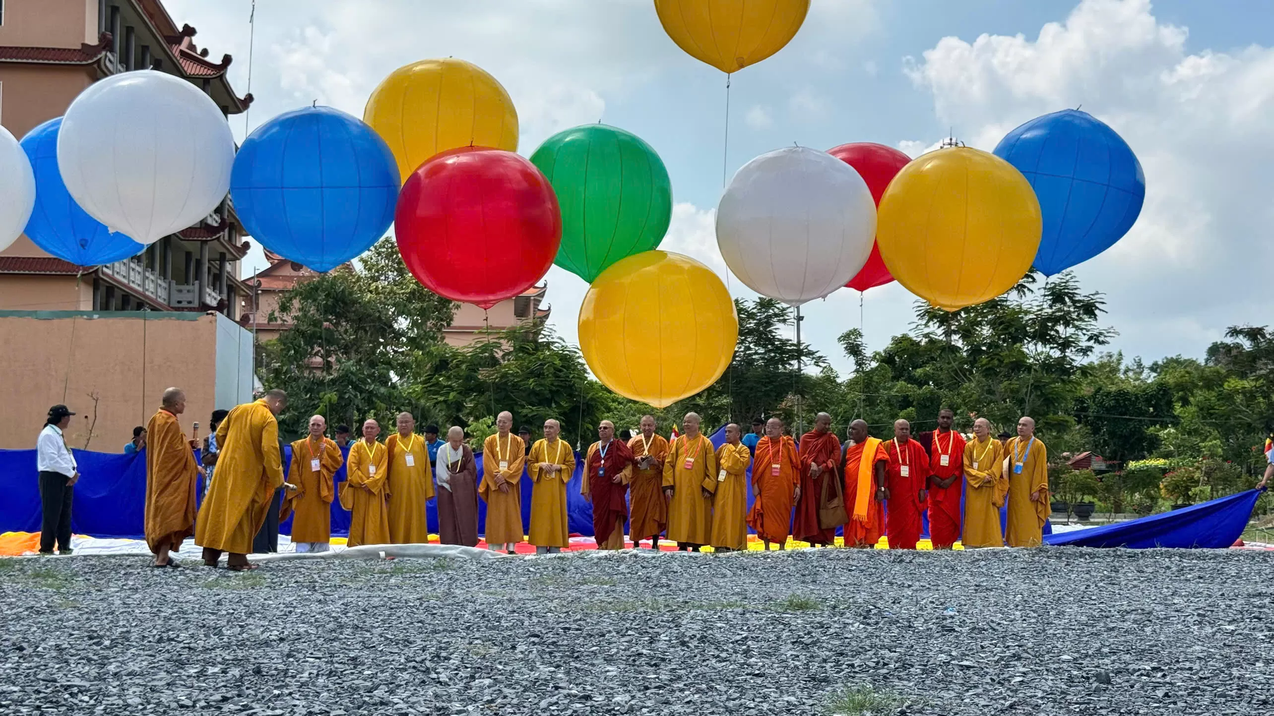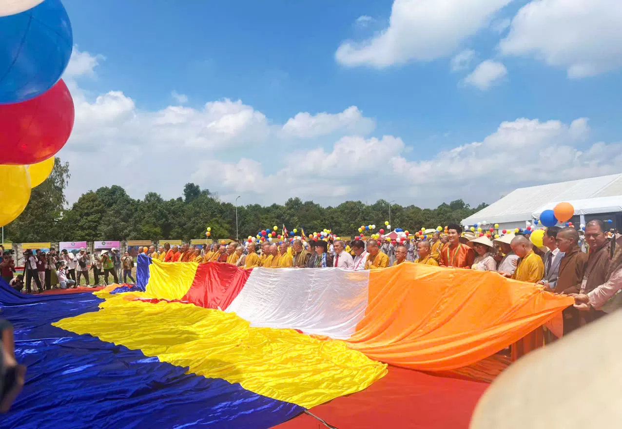 Lá cờ Phật giáo với diện tích 500m² – kết tinh của năm sắc màu truyền thống: xanh, vàng, đỏ, trắng, cam – được giương cao trước Giảng đường Minh Châu, như một ngọn hải đăng tâm linh, chiếu rọi con đường tỉnh thức và hòa hợp. Chiều dài 25,69 mét biểu trưng cho 2.569 năm Đức Phật thị hiện giữa cõi Ta-bà, còn chiều ngang 19,47 mét là biểu tượng cho sức sống trường tồn của Chánh pháp, đang lan tỏa khắp hành tinh. Trong tiếng chuông trống Bát Nhã ngân vang – âm thanh khơi dậy chánh niệm và thanh lương nội tâm – hàng ngàn chư Tăng Ni, Phật tử và hơn 50 đoàn đại biểu quốc tế đã đồng thanh nhất tâm hướng về đại kỳ, như hướng về cội nguồn giác ngộ.
