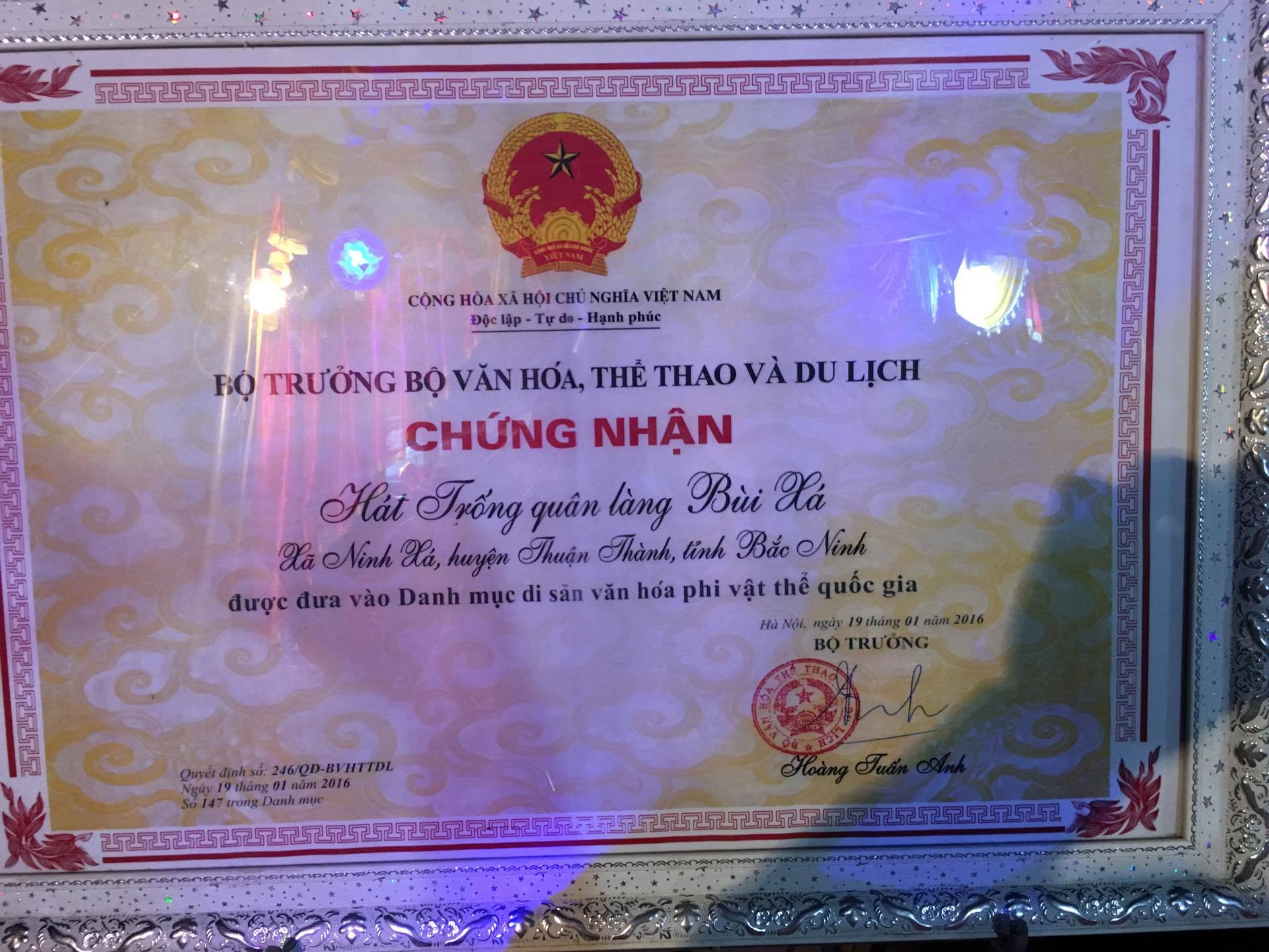 Rất vinh dự và tự hào, ngày 19/1/2016 Hát Trống quân làng Bùi Xá được Bộ Văn hóa TT&DL ký Quyết định số 246/QĐ-BVHTTDL chứng nhận “Hát trống quân làng Bùi Xá” được đưa vào danh mục di sản văn hóa phi vật thể quốc gia.