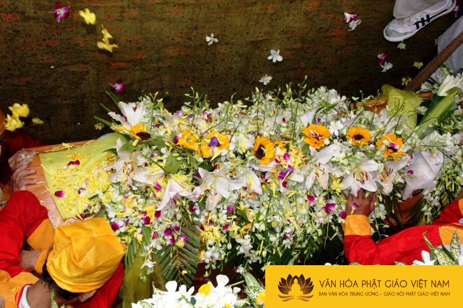 9 giờ 30, kim quan Hòa thượng được cung thỉnh nhập bảo tháp vô tung, chư tôn đức Tăng Ni, quan khách và Phật tử đã xúc động rải hoa lần lượt tiễn biệt một vị giáo phẩm, bậc Thầy khả kính.