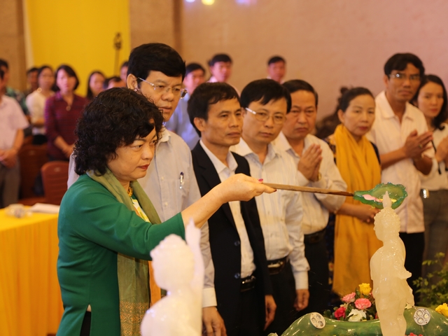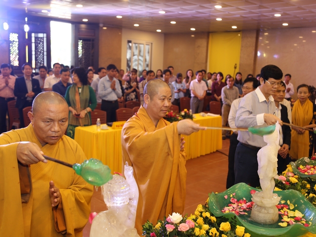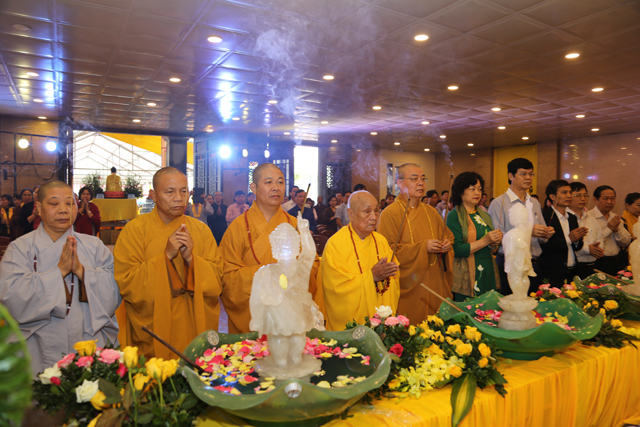Cuối buổi lễ, chư Tôn đức và toàn thể hội chúng đã dâng hương bạch Phật, khai lễ, xướng tụng hồng danh Đức Bản Sư Thích Ca Mâu Ni Phật, tụng kinh kính mừng Phật đản. Chư tôn đức cùng toàn thể quý vị đại biểu và Phật tử tham gia nghi thức tắm Phật trong niềm hoan hỷ.
