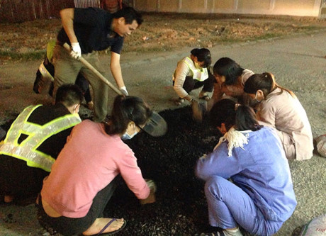 Ngô Văn Đông, sinh viên năm cuối Đại học GTVT đi kiểm tra từng hố, chỉ các bạn dùng búa đập mấy miếng vật liệu cho nhỏ hơn trước khi rải nhựa đường và san phẳng. Mỗi lần có phương tiện đi tới, dưới sự hướng dẫn của hai “hoa tiêu”, cả nhóm phải tạm dừng công việc, đứng gọn vào lề đường để đảm bảo an toàn rồi lại tiếp tục công việc. Đêm tháng 4 khá lạnh, nhưng lưng áo mấy “công nhân làm đường” đã lấm tấm mồ hôi. Sau gần một giờ hoàn thành thi công, các bạn vẫn tiếp tục hướng dẫn, phân luồng cho các phương tiện để đảm bảo độ an toàn cho những điểm vừa vá.