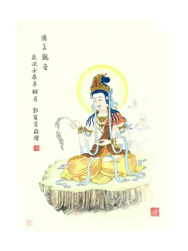 Hình tượng Quán Âm ngồi trên vách đá, tay phải cầm nhành dương liễu, tay trái đặt trước bụng, biểu thị phẩm đức cao quý của Ngài, nên được gọi là Đức Vương. Ngài tượng trưng cho phúc lộc và mang ý nghĩa bảo hộ chúng sinh được hưởng phúc và lộc vẹn toàn.