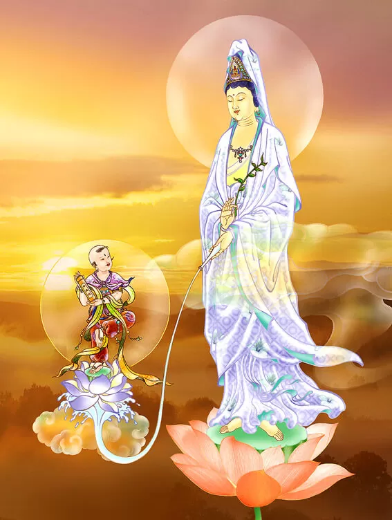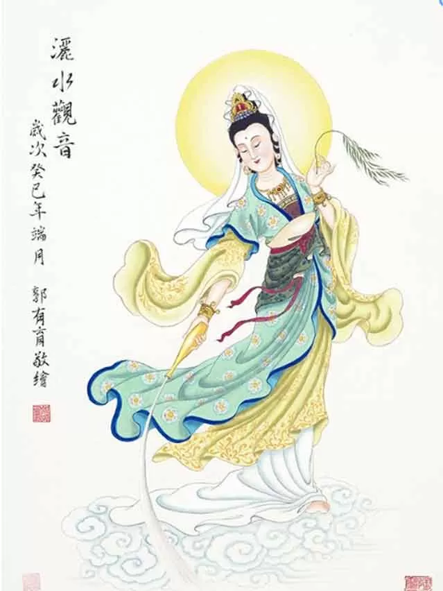 Hình ảnh tay trái cầm bình tịnh để rưới nước thanh tịnh, tay phải cầm cành liễu hoặc làm pháp ấn, tượng trưng cho hành động giải thoát và giúp chúng sinh thoát khỏi khổ đau. Nước trong Phật giáo thường được dùng để chỉ sự từ bi, giống như mưa pháp có thể tẩy rửa nghiệp chướng và làm sạch tâm hồn.