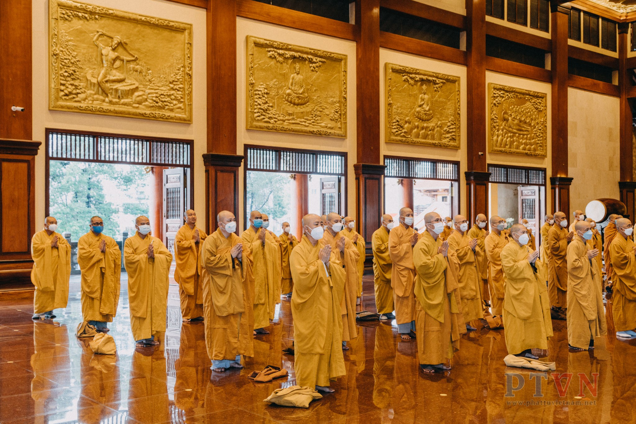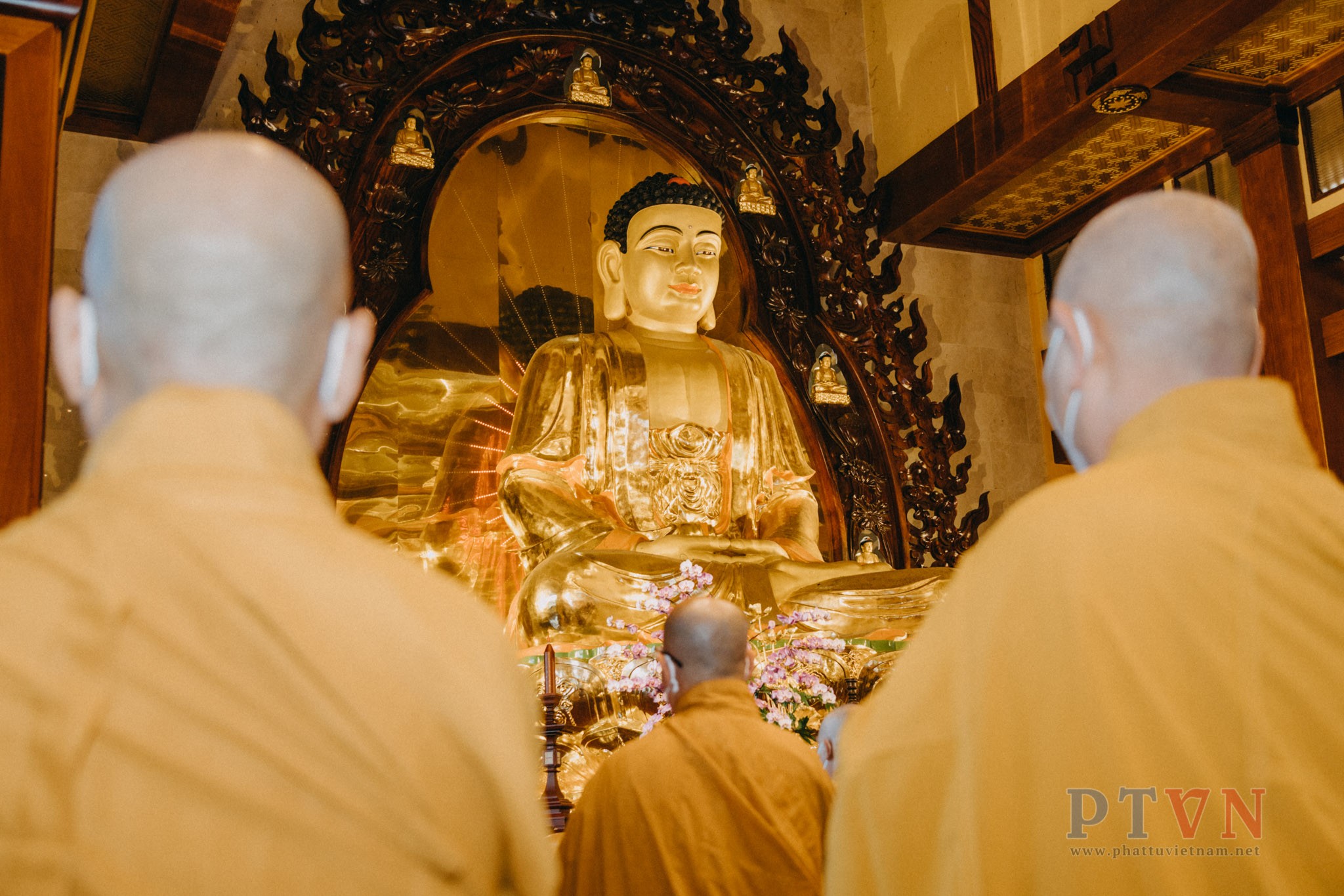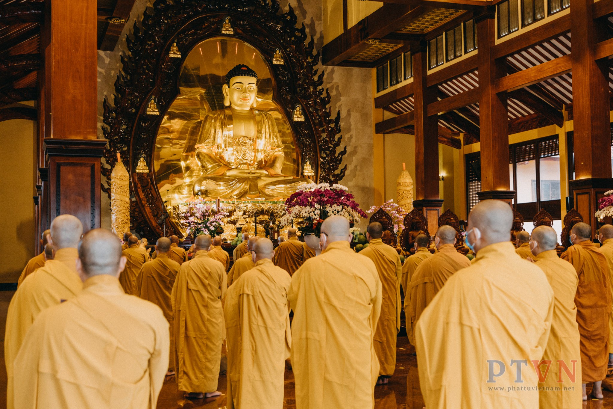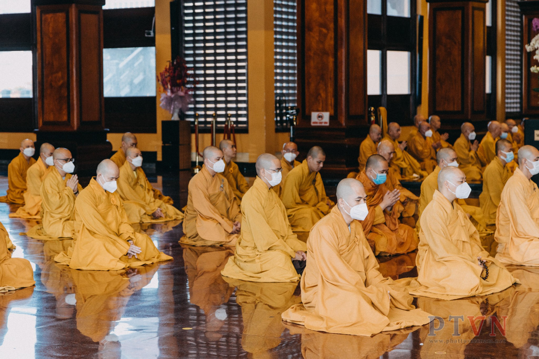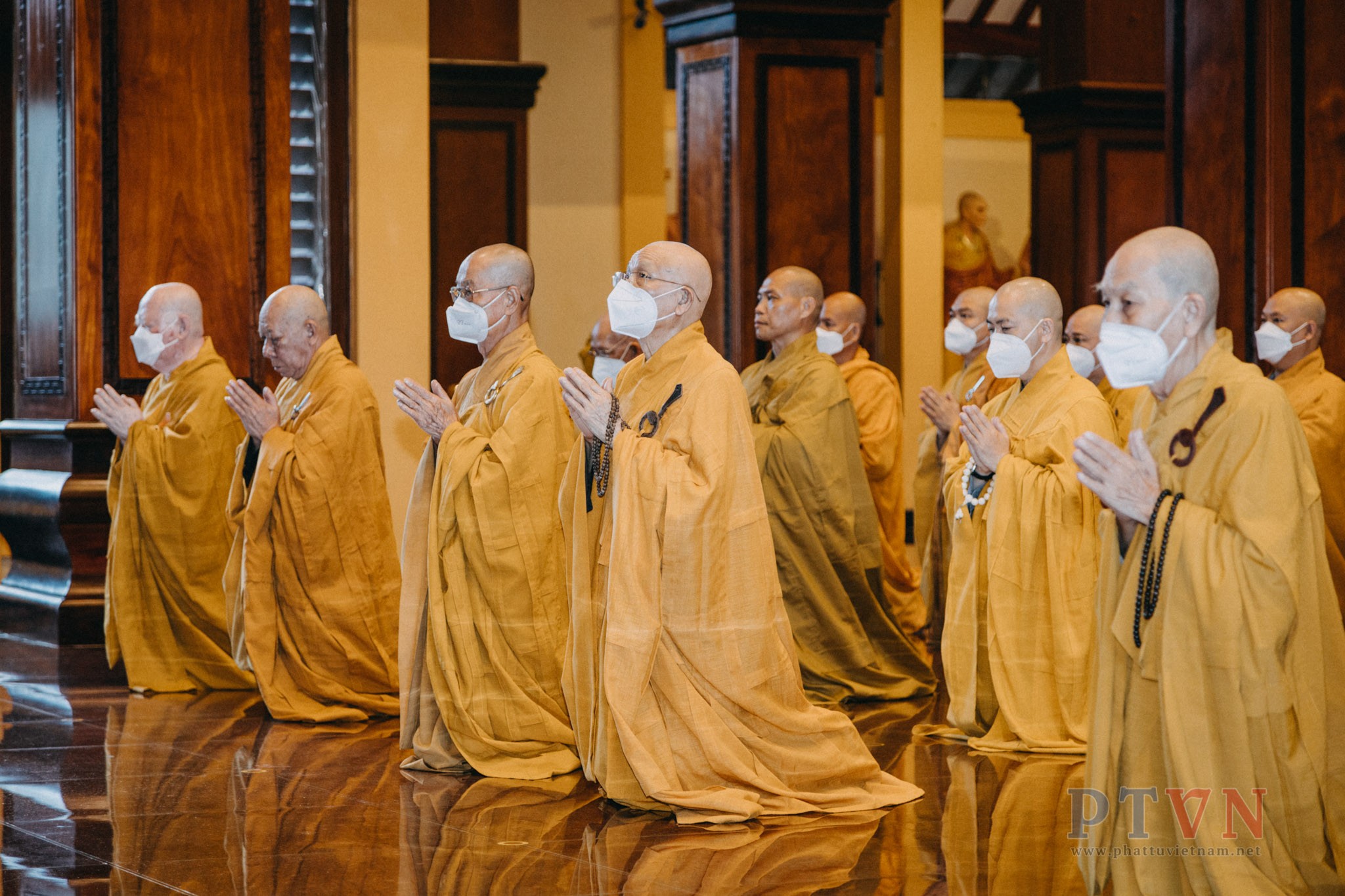 Tại chánh điện, Trưởng lão Hòa thượng Thích Trí Quảng – Quyền Pháp chủ GHPGVN niêm hương bạch Phật với sự dẫn lễ của Hòa thượng Thích Lệ Trang – Phó ban Trị sự kiêm Trưởng ban Nghi lễ Phật giáo TP, đại chúng đảnh lễ Tam bảo, phát lồ sám hối theo pháp.
