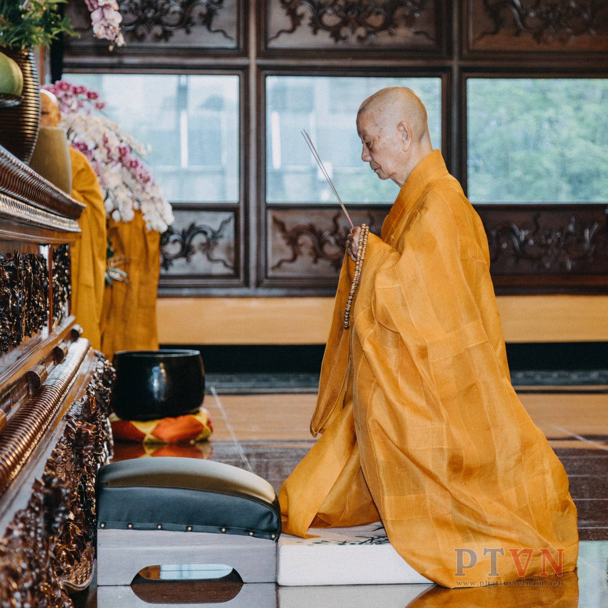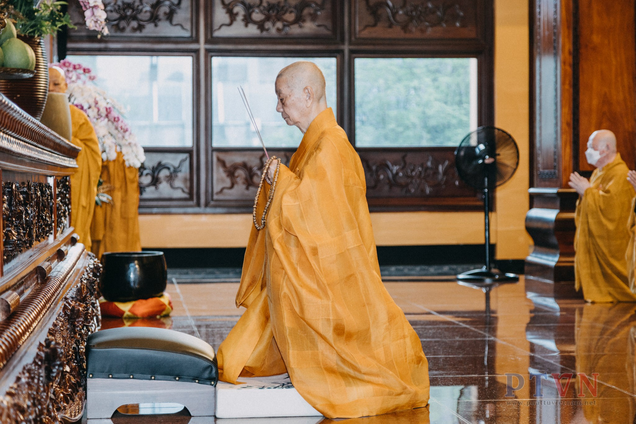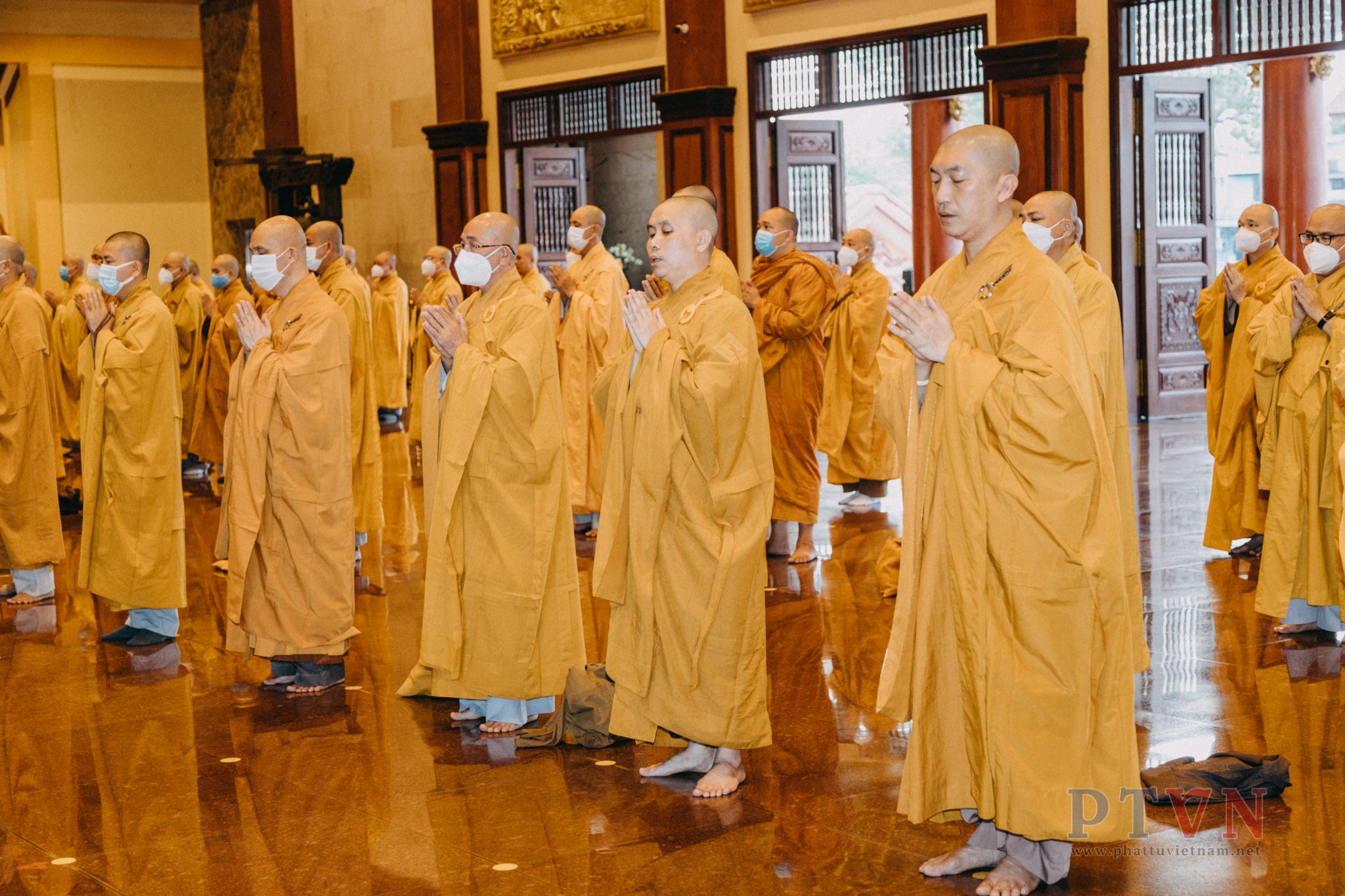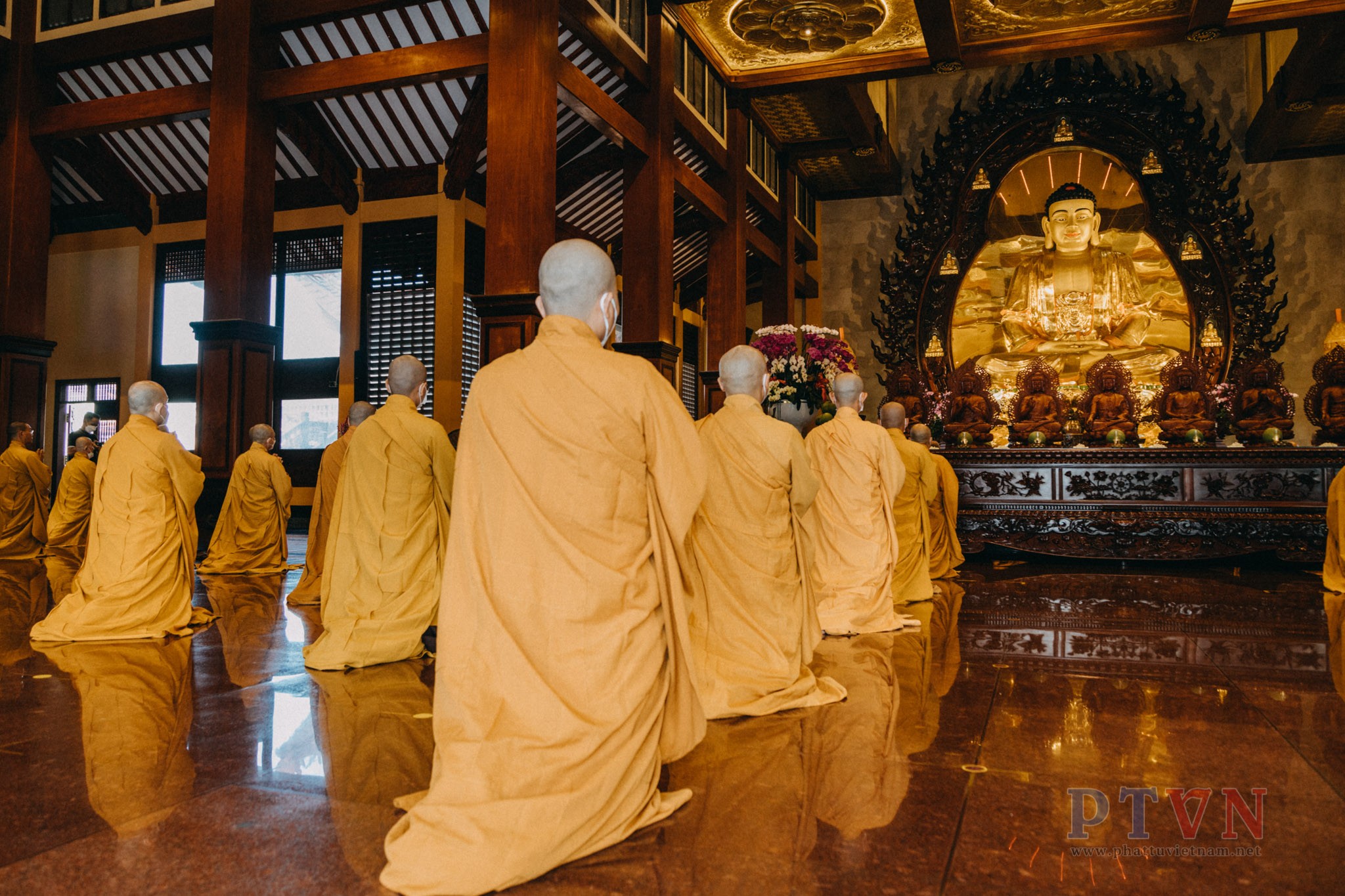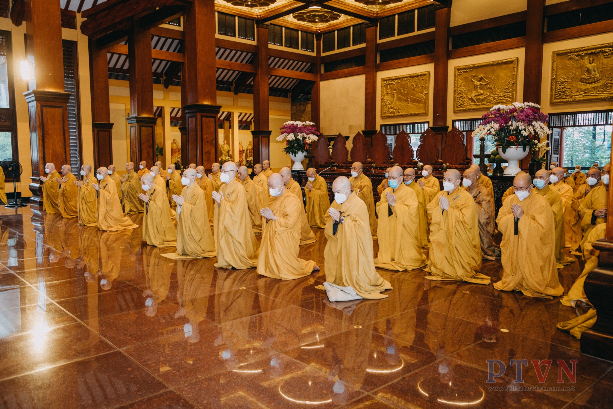 Tại chánh điện, Trưởng lão Hòa thượng Thích Trí Quảng – Quyền Pháp chủ GHPGVN niêm hương bạch Phật với sự dẫn lễ của Hòa thượng Thích Lệ Trang – Phó ban Trị sự kiêm Trưởng ban Nghi lễ Phật giáo TP, đại chúng đảnh lễ Tam bảo, phát lồ sám hối theo pháp.