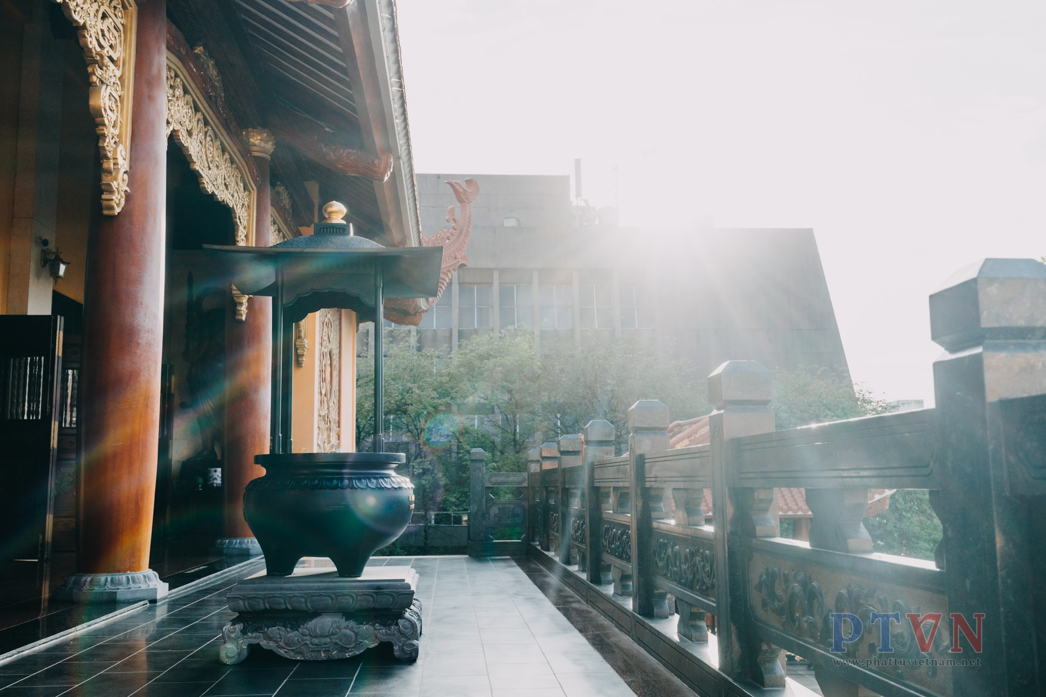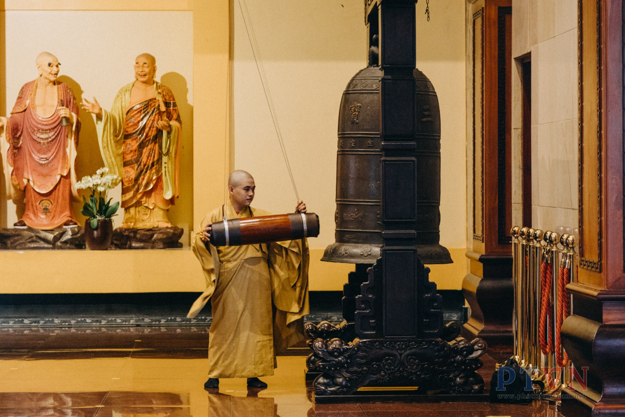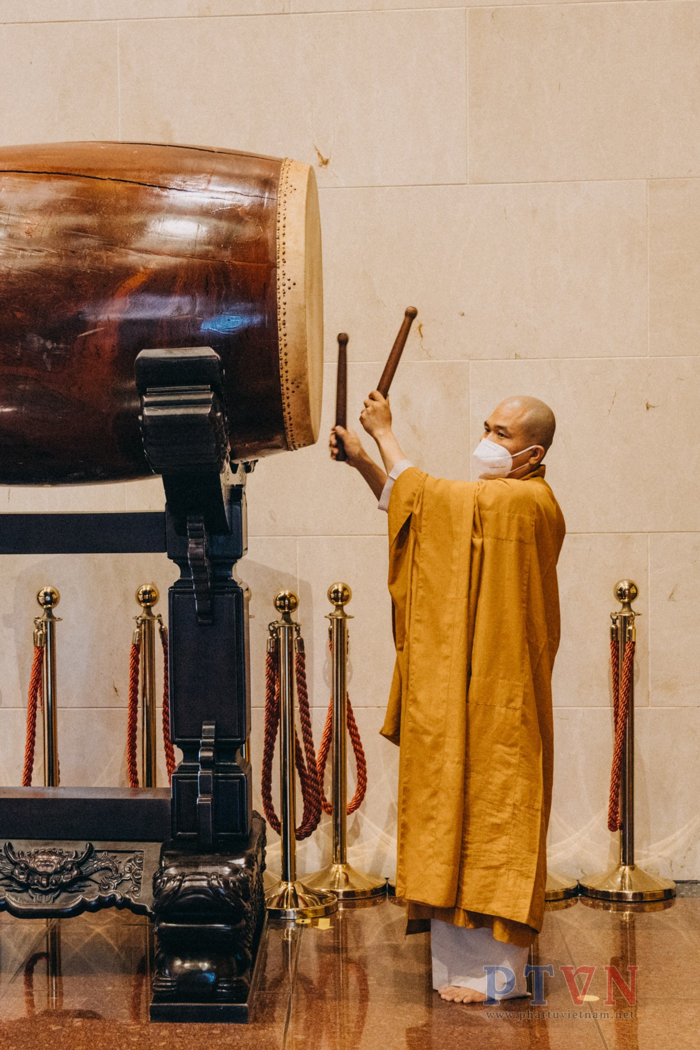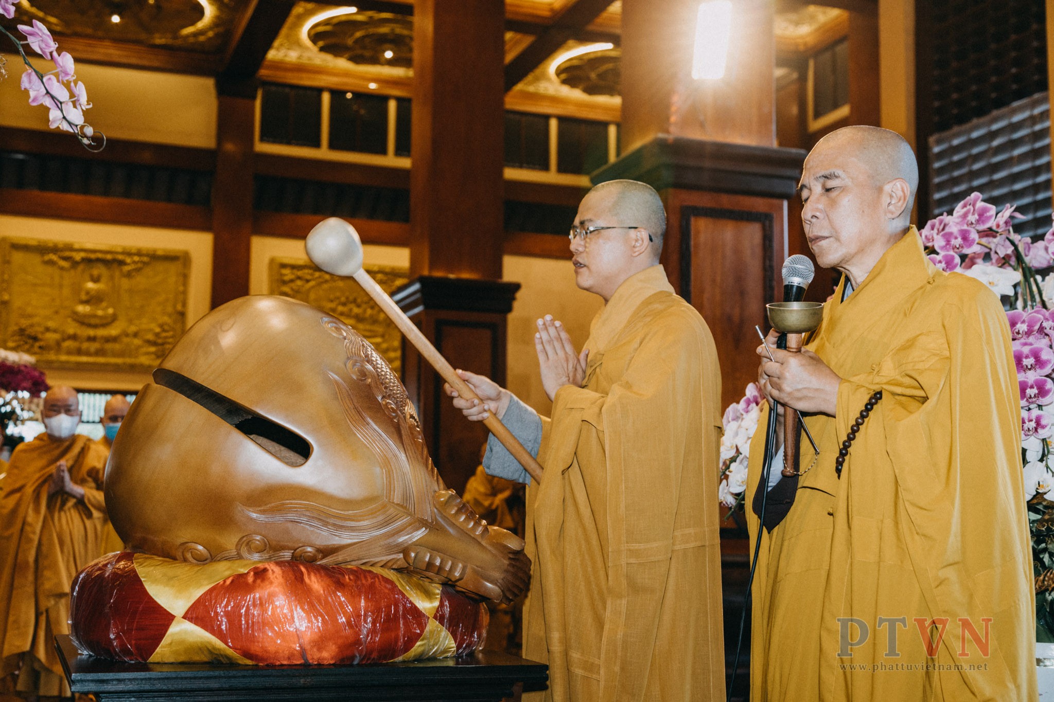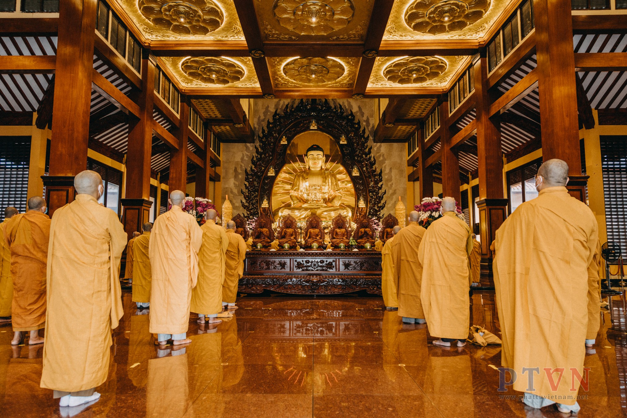Tại chánh điện, Trưởng lão Hòa thượng Thích Trí Quảng – Quyền Pháp chủ GHPGVN niêm hương bạch Phật với sự dẫn lễ của Hòa thượng Thích Lệ Trang – Phó ban Trị sự kiêm Trưởng ban Nghi lễ Phật giáo TP, đại chúng đảnh lễ Tam bảo, phát lồ sám hối theo pháp.
