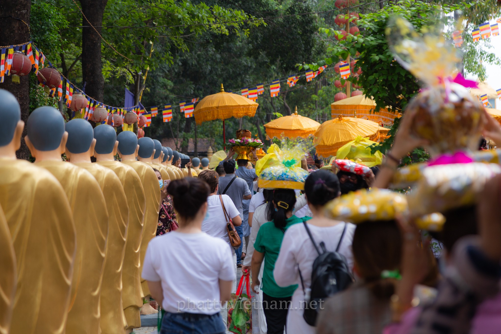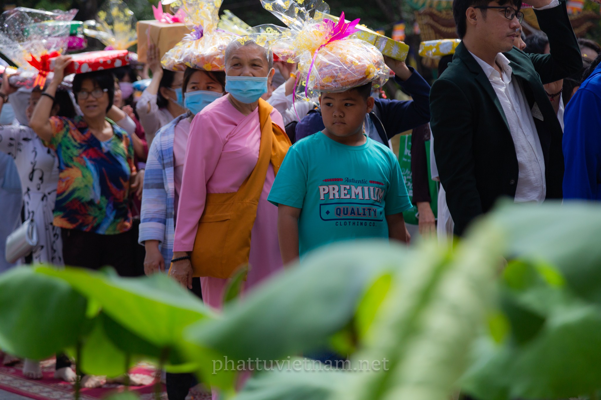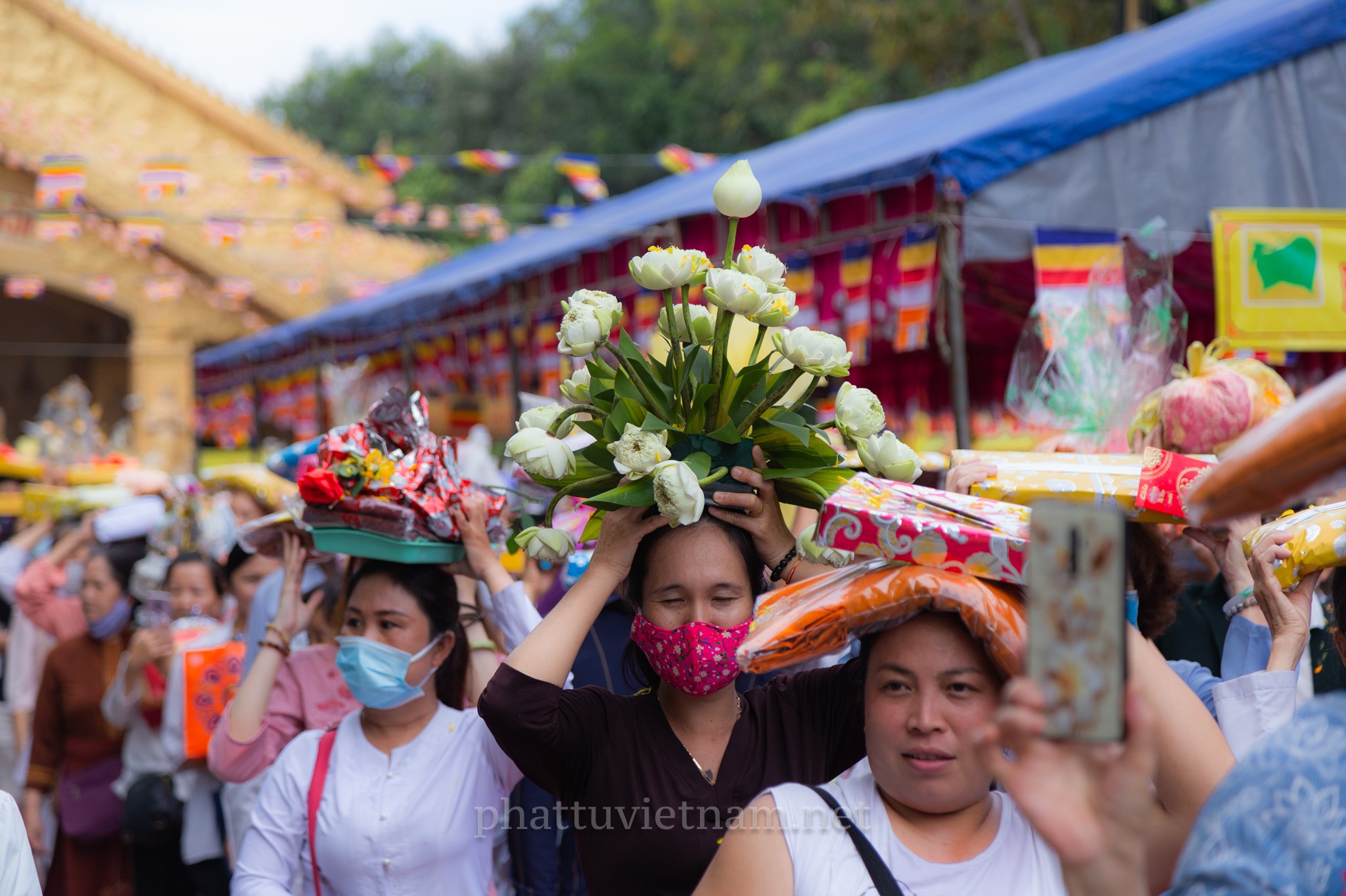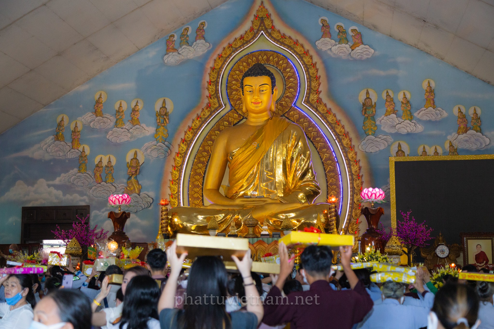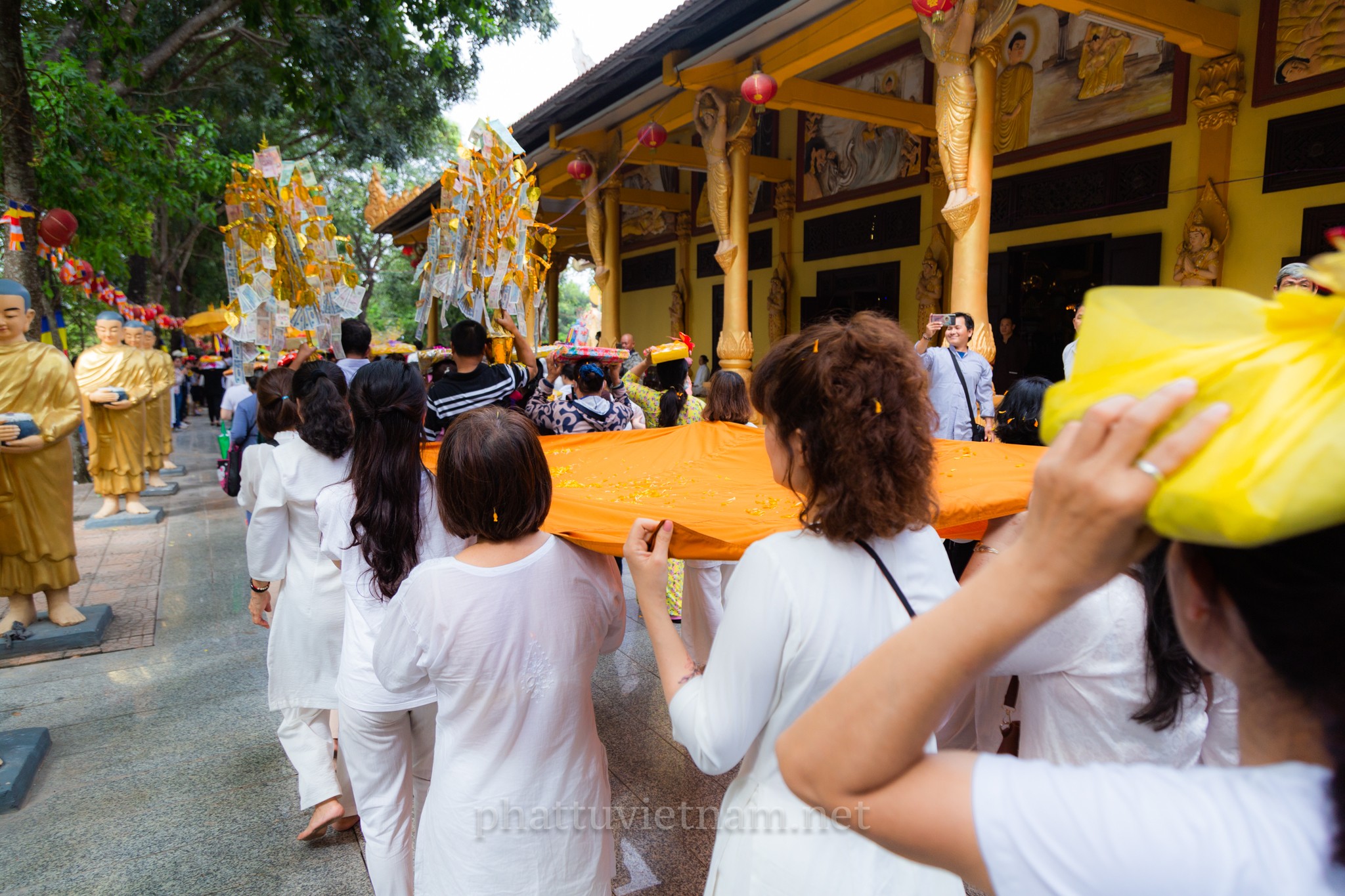 Tiếp đó là nghi thức nhiễu y 3 vòng do HT.Thích Bửu Chánh hướng dẫn hàng Phật tử đội y, bát và các vật dụng cúng dường đi quanh Phật điện trong niềm hoan hỷ và lời kệ ngân vang: