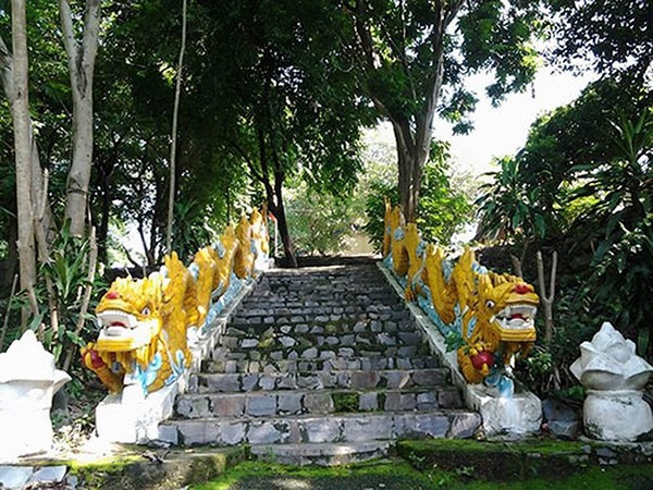 Đường lên chùa phải bước lên 20 bậc thềm đá rêu phong cổ kính, hai bên có hai con rồng chế tạc bằng đá |