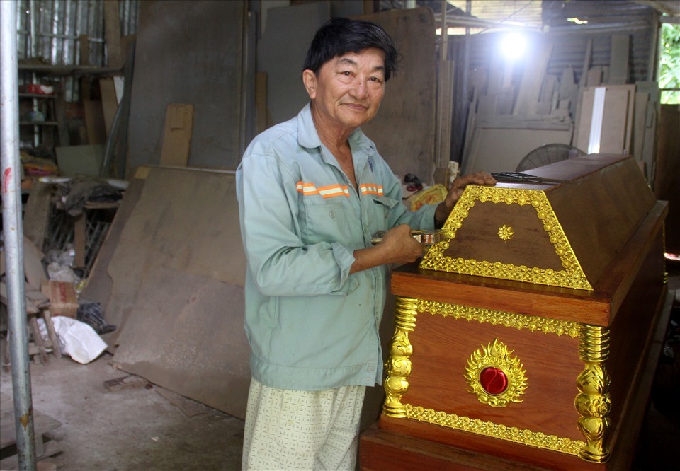 Ông Tân có một nguyên tắc là không cần biết gia cảnh là sao, đến xin là cho. Đến nay ông đã thành thạo cưa ván, đóng nắp quan tài, sơn phết, trang trí…