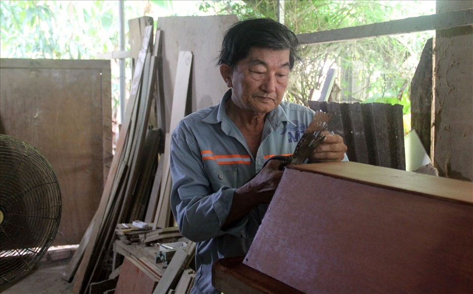 Đầu giờ chiều, ông Tân đang tất bật hoàn thiện cho chiếc hòm mới vừa đóng xong: “Đáng lẽ cần sơn lại một lần nữa, nhưng có người đang cần gấp mà hòm cũng ổn rồi nên tôi tranh thủ trang trí để họ mang đi chứ không kịp” – vừa nói ông Tân vừa chăm chú trang trí cho chiếc hòm.