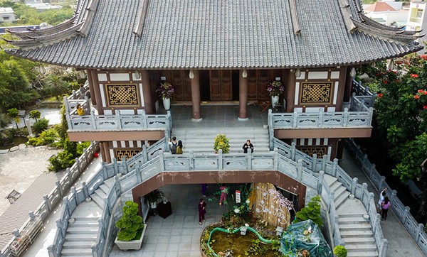 | Trên nóc của nhà tăng và khách đường là tòa tháp với màu đỏ và mái ngói ít hình rồng phượng. Điểm nhấn là phần chóp tháp màu vàng cao vút trên nền trời, kiến trúc thường thấy trong đền chùa Nhật Bản. |
