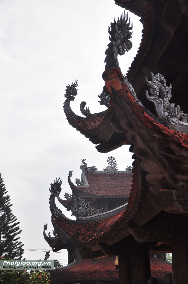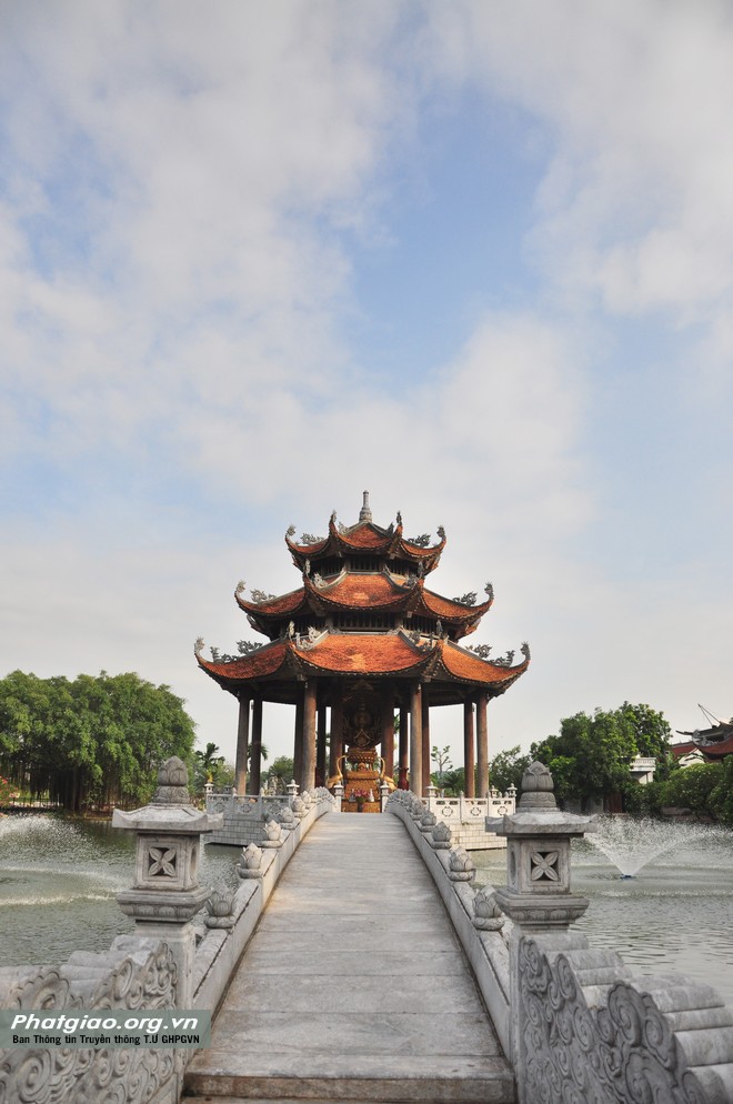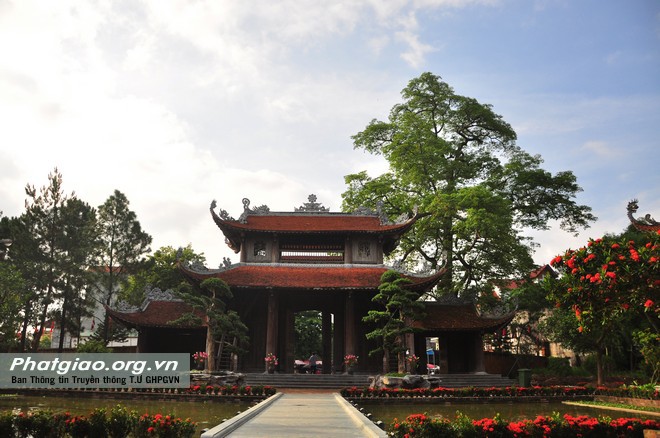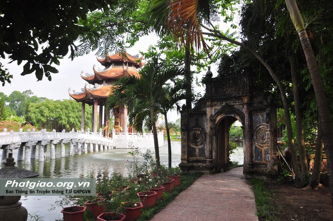 Bước qua cổng Tam quan, hai bên là tháp chuông và lầu trống cao, uy nghi với đường nét truyền thống, có ba tầng mái cong vút dựng trên bộ khung gỗ chắc chắn, soi bóng bên hồ nước rộng ở giữa cũng là một cây cầu đá.