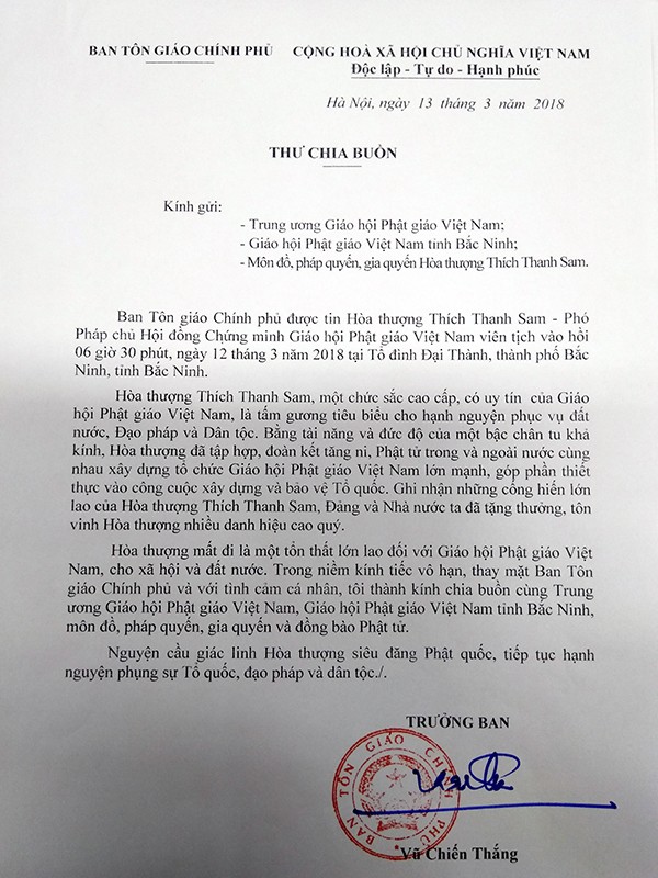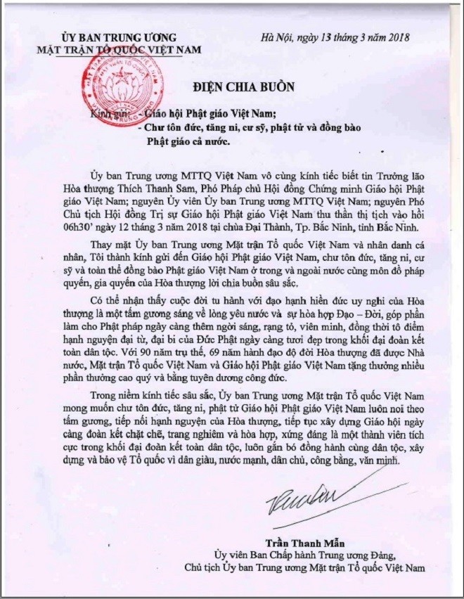 Bức thư có đoạn: “Trong niềm kính tiếc sâu sắc, Ủy ban Trung ương Mặt trận Tổ quốc Việt Nam mong muốn chư tôn đức, tăng ni, phật tử Giáo hội Phật giáo Việt Nam luôn noi theo tấm gương, tiếp nối hạnh nguyện của Hòa thượng, tiếp tục xây dựng Giáo hội ngày càng đoàn kết chặt chẽ, trang nghiêm và hòa hợp, xứng đáng là một thành viên tích cực trong khối đại đoàn kết toàn dân tộc, luôn gắn bó đồng hành cùng dân tộc, xây dựng và bảo vệ Tổ quốc vì dân giàu, nước mạnh, dân chủ, công bằng, văn minh.”