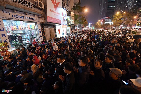 | Cảnh tượng vừa diễn ra tối 23/02 (mùng 8 tháng Giêng). Người dân ngồi tràn từ trong ra bên ngoài cổng chùa Phúc Khánh lẫn lòng đường, vái vọng vào trong. Ảnh: Tiến Tuấn. |