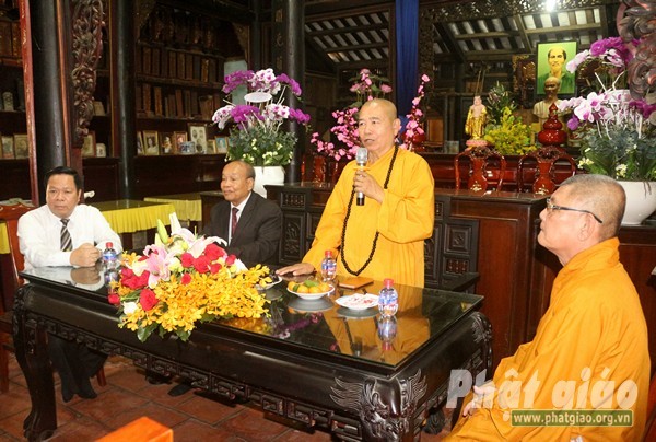 HT.Thích Thiện Duyên thay mặt BTS Phật giáo tỉnh chia sẻ đến đoàn Bộ Lễ nghi và Tôn giáo Campuchia về lịch sử hình thành ngôi chùa Hội Khánh cũng như các mặt văn hóa, nghi lễ, giáo dục của Phật giáo Bình Dương.