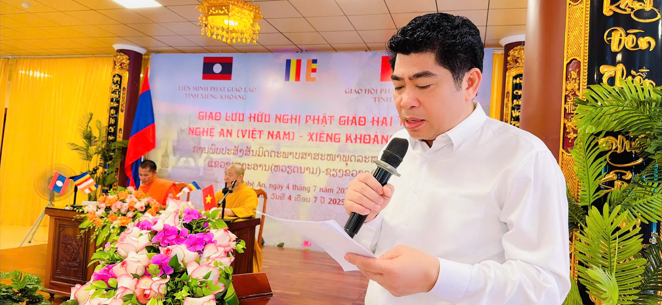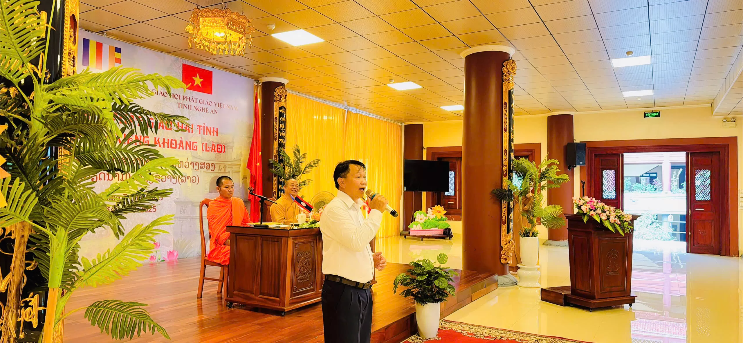 Chương trình giao lưu hôm nay là dịp quý báu để chúng ta cùng nhau làm thắm thêm tình hữu nghị thiêng liêng giữa hai đất nước, cùng chia sẻ kinh nghiệm trong tu học và hoằng pháp, cùng thắp lên ngọn đuốc trí tuệ và từ bi, như lời Đức Phật đã dạy, để soi sáng cuộc đời, làm lợi lạc cho nhân sinh. Đồng thời, đây cũng là dịp để tăng cường mối quan hệ đoàn kết, hợp tác giữa Giáo hội Phật giáo tỉnh Nghệ An và Liên minh Phật giáo Lào tỉnh Xiêng Khoảng, góp phần vào việc củng cố tình hữu nghị giữa nhân dân hai tỉnh, hai quốc gia. Tăng Ni, Phật tử Nghệ An gửi lời cảm ơn chân thành đến phái đoàn Liên minh Phật giáo Lào tỉnh Xiêng Khoảng đã không quản ngại đường sá xa xôi, sơn xuyên cách trở, mang theo tâm bi nguyện to lớn và tấm lòng hữu nghị sâu sắc, đoàn kết thủy chung đến với tỉnh Nghệ An thân thương, quê hương Bác Hồ muôn vàn kính yêu.