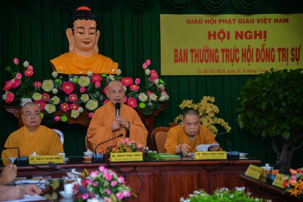 Nhấn mạnh Hội nghị Ban Thường trực lần này diễn ra đúng vào thời điểm giữa năm, của năm đầu thực hiện Nghị quyết và Chương trình hoạt động Phật sự nhiệm kỳ khoá VIII, trong bối cảnh hơn nửa năm nỗ lực phấn đấu của Tăng Ni, Phật tử, cả hệ thống Giáo hội đã có nhiều chuyển biến tích cực và đứng trước những thời cơ, vận hội mới, tốt đẹp cho quá trình hội nhập, phát triển toàn diện của Giáo hội Phật giáo Việt Nam, Hoà thượng Chủ tịch đề nghị Ban Thường trực và các đại biểu tham dự Hội nghị phát huy tinh thần cộng đồng trách nhiệm, đoàn kết hoà hợp, kỷ cương, tập trung nghiên cứu, thảo luận kỹ, cho ý kiến để hoàn thiện các báo cáo, quy chế làm việc của Ban Thường trực HĐTS, Ban Trị sự GHPGVN cấp tỉnh, huyện; nội quy Ban Tăng sự Trung ương, đề án và xem xét, quyết định tại hội nghị lần này.