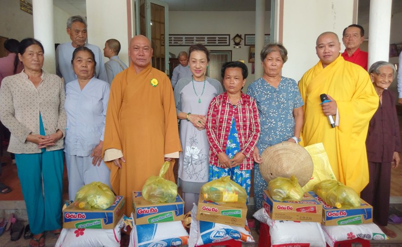 Đại diện hội từ thiện chùa Bát Nhã tặng quà cho bà con khó khăn