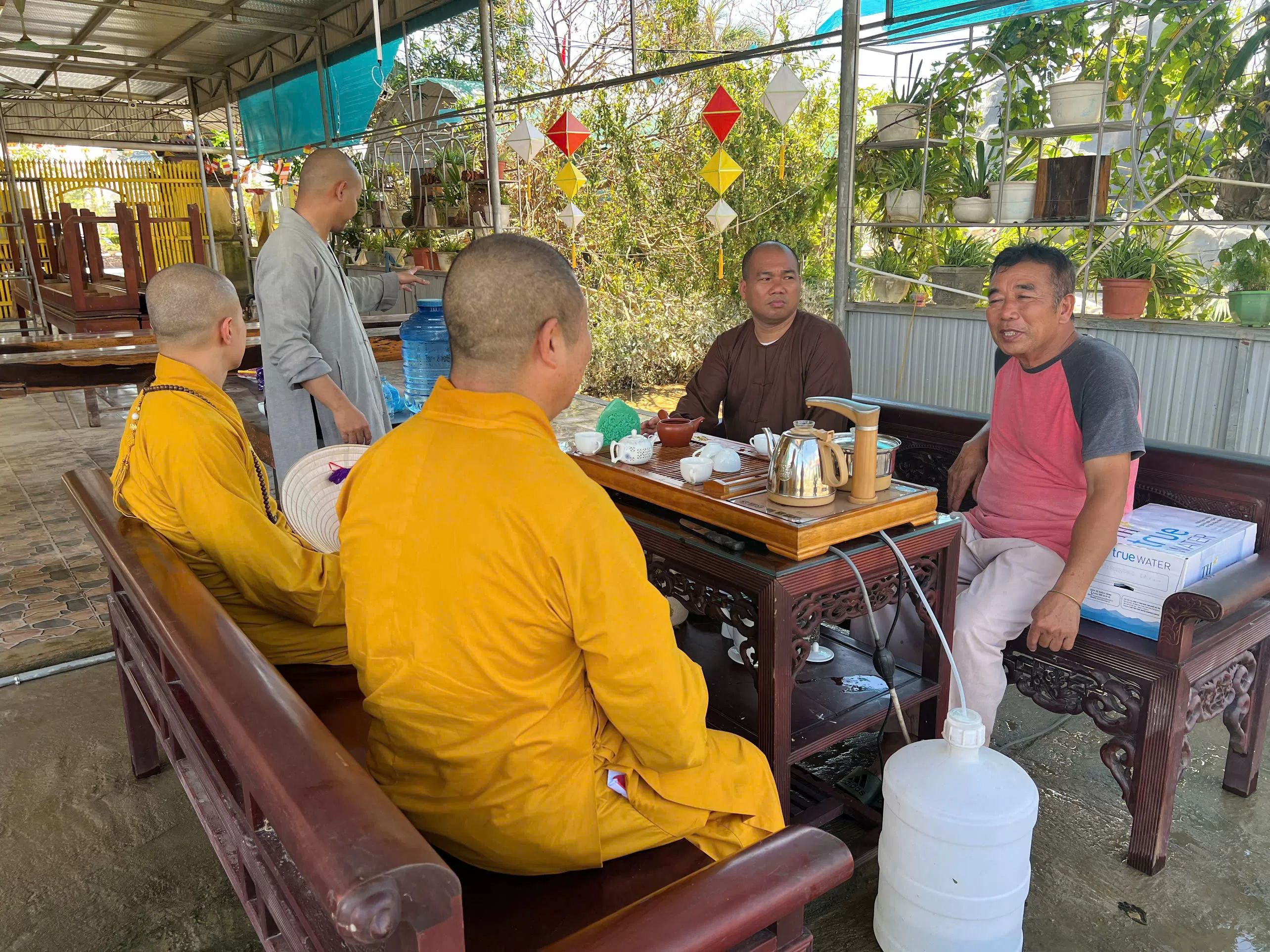 Đoàn đến thăm Chùa Phúc Thành ở xã Hưng Châu cũ, Đại đức Thích Định Tuệ - UVTT BTS, Trưởng Ban TTTT GHPGVN tỉnh, Trụ trì Chùa bộc bạch: “Chúng con may mắn hơn ở chùa ngay chân đê, mặc dù bị bão tốc nhà, đổ tượng nhưng vẫn cố gắng vượt qua khắc phục, rồi tạm gác lại để đi vận động các mạnh thường quân ủng hộ các nơi bị ngập sâu hơn. Sáng nay vừa đi bên xã Nam Cường cũ, nghe Thầy Minh Hải (Chánh Văn phòng Tỉnh hội) gọi điện có Hòa thượng Phó Thường trực và Quý Thầy trong Ban Trị sự đến thăm, con rất cảm động bùi ngùi nên phát quà xong chạy gấp về đây để đón Đoàn ạ!”.