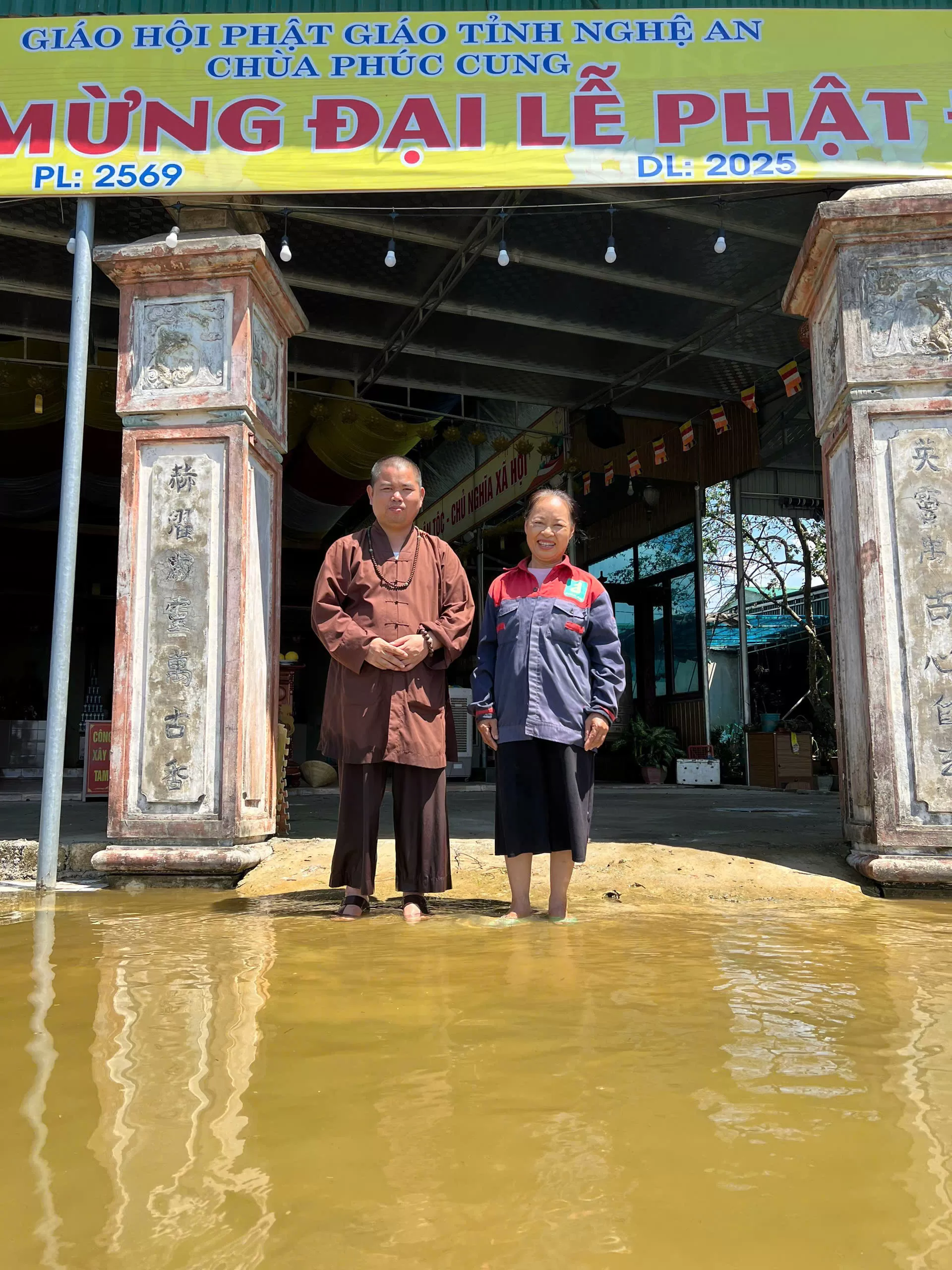 Tiếp đến, Đoàn ghé thăm Chùa Long Hoa ở xã Hưng Long cũ. Mặc dù cao hơn nhưng sáng nay nước mới rút, tranh thủ Chư Tăng và Phật tử quét dọn được chính điện và nhà Tổ. Gần trưa, Đoàn sang 9 Lam thăm Chùa Phúc Cung ở xã Nam Phúc cũ vẫn còn nước ngập gần 1 km nữa, nên Đoàn phải lội bộ vào; đây là vùng chiêm trũng và có nhiều đỉa khi nước dâng lên. Nghe Phật tử lắng lòng giãi bày tâm sự: “Mấy bữa ni ở đây lụt quá không có gì ăn uống cả, chỉ có lộc kẹo bánh cúng từ rằm tháng bảy thôi. Sáng ni nước xuống đỡ, Sư cô (Thích Quảng Tịnh – Trụ trì Chùa) lội ra quãng tê, có xe mô đi bên Đức Thọ qua đón lặn lội ra Diễn Châu để có Phật tử cho ít gạo và rau đem về, mà đường xá trục trặc răng giờ chưa thấy về (11h45’). Khổ lắm các Thầy ơi, chùa giữa cánh đồng mênh mông là nước gi cả, chả có ai đến. Hôm nay, các Thầy đến thăm động viên, lại cho quà chúng con cảm động quá. A Di Đà Phật”.