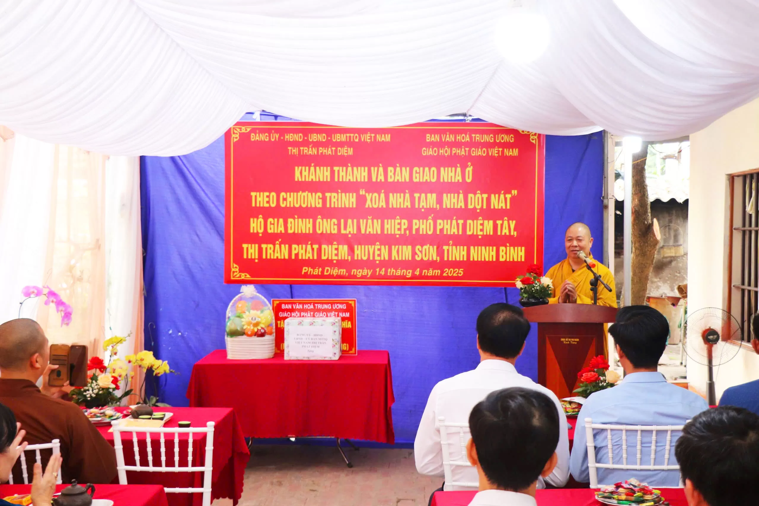 Phát Diệm – Ninh Bình, ngày 14/4/2025 — Trong tinh thần phụng sự đạo pháp và dân tộc, thể hiện lòng từ bi cứu khổ của người con Phật và hưởng ứng chủ trương xóa nhà tạm, nhà dột nát theo chỉ đạo của Thủ tướng Chính phủ; Hòa thượng Thích Thọ Lạc – UVTT HĐTS, Trưởng Ban Văn hoá Trung ương GHPGVN, Trụ trì Tổ đình Kim Liên (Chùa Đồng Đắc) – đã phối hợp cùng chính quyền địa phương tổ chức lễ khánh thành và bàn giao nhà tình thương cho hộ gia đình ông Lại Văn Hiệp, ngụ tại Phố Phát Diệm Tây, Thị trấn Phát Diệm, Huyện Kim Sơn, Tỉnh Ninh Bình.