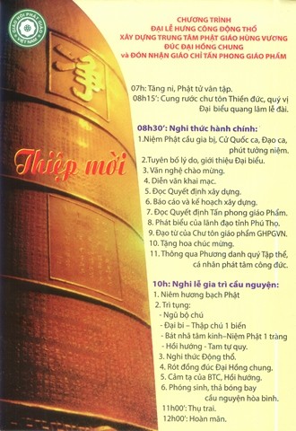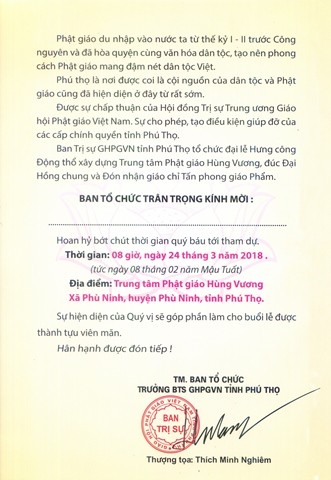 Ban TTTT tỉnh Phú Thọ gửi đến Chư tôn đức tăng, ni, quý vị thiện hữu tri thức, các nhà hảo tâm, các mạnh thường quân cùng toàn thể nhân dân phật tử gần xa quan tâm đến Phật giáo đất Tổ Thiệp mời trân trọng.