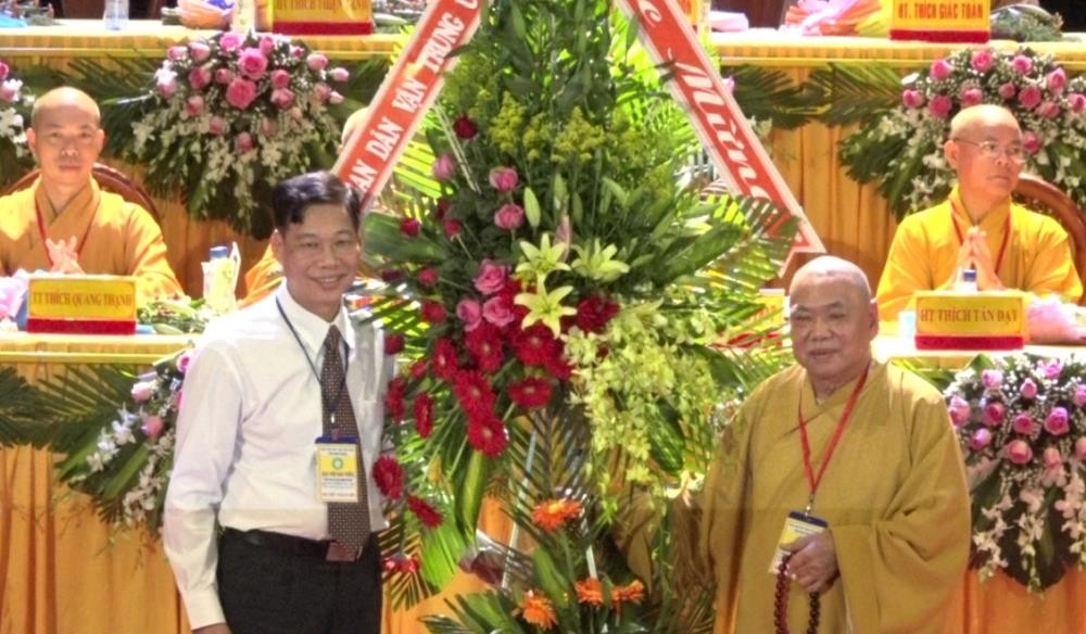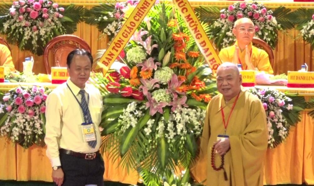 ông Trà Quang Thanh trao tặng lẵng hoa chúc mừng của Ban Tôn giáo Chính phủ