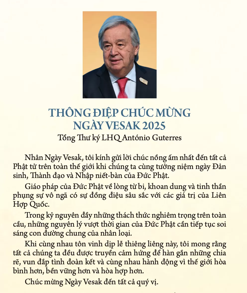Bên cạnh đó, Đại lễ Vesak LHQ 2025 được vinh hạnh đón nhận các Thông điệp chúc mừng của Lãnh đạo Phật giáo quốc tế gồm Trung Quốc, Campuchia, Myanmar, Tích Lan, Thái Lan, Lào... Thông điệp video về Vesak 2025 của Tổng Thư ký LHQ António Guterres;Tổng Giám đốc UNESCO Audrey Azoulay; Tổng thống Ấn Độ và phát biểu của Ngài Kiren Rijiju - Bộ trưởng các vấn đề Quốc hội của Chính phủ Ấn Độ; Đại diện các chính phủ Ấn Độ, Buryatia, Hoa Kỳ, Campuchia, Lào, Hungary V.V.; Phát biểu của Tổng thống Sri Lanka Anura Kumara Dissanayake; Phát biểu của Ngài Zuraev Igor Ivanovich - Phó Thủ tướng Cộng hòa Buryatia - Người đứng đầu Chính quyền Buryatia đại diện của Tổng thống Putin, LB Nga; Phát biểu của Ngài Vilayvong Boudakham - Bộ trưởng Nội vụ Lào; Phát biểu của Ngài Chay Borin - Bộ trưởng nghi lễ và tôn giáo Campuchia.