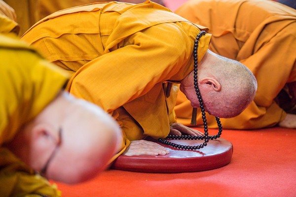 Đúng 8h, các tăng ni bắt đầu làm lễ tưởng niệm. Không khí trang nghiêm với lời trì chú của các nhà sư, phật tử cùng tiếng mõ, lời kinh kệ vang khắp chùa.
