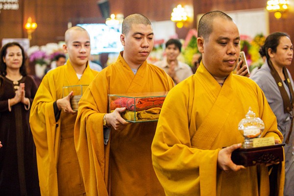 | Sau 2 giờ làm lễ tưởng niệm, các tăng ni mang xá lợi, y phục và kinh Phật của Bồ Tát Thích Quảng Đức về kho lưu trữ. |