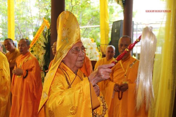 Sau nghi thức cung tống kim quang, Ban Nghi lễ cung thỉnh HT.Thích Thiện Duyên, Phó Pháp chủ HĐCM tuyên pháp ngữ và cử hành nghi thức phất trần.